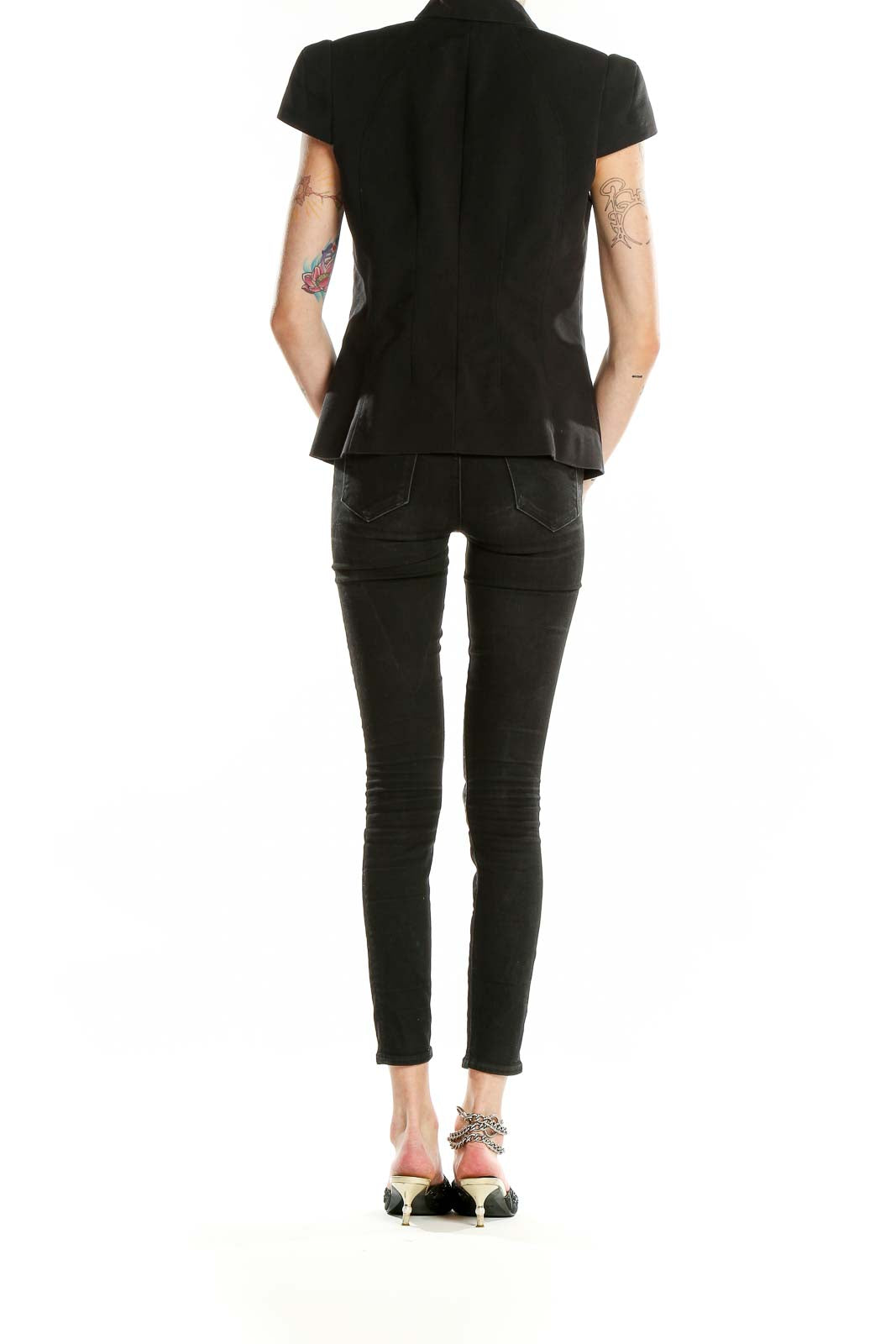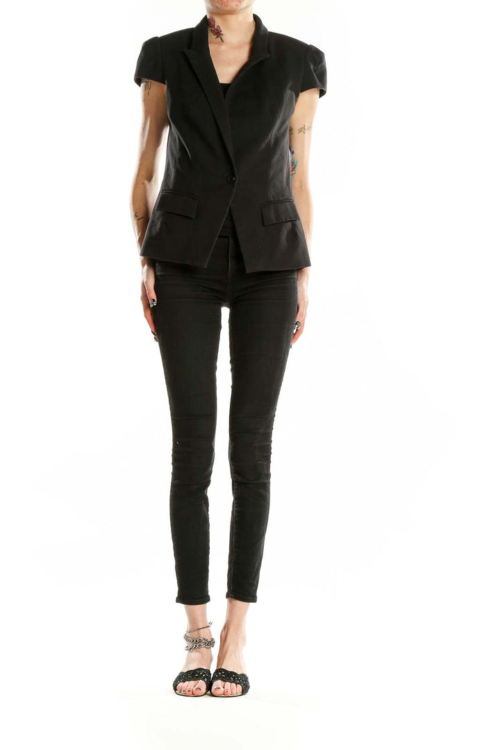 Make a bold statement with this sleek black cap sleeve blazer from Bebe. Crafted from a comfortable blend of cotton, polyester, and spandex, this versatile piece offers both style and flexibility. The tailored silhouette features a single-button closure and structured shoulders, creating a polished look perfect for the office or a night out. Flap pockets at the waist add a classic touch, while the cap sleeves provide a modern twist on the traditional blazer design. The excellent condition of this garment ensures you'll look impeccable every time you wear it. Pair it with skinny jeans for a chic casual outfit or dress it up with tailored trousers for a more formal ensemble. This Bebe blazer is a must-have addition to any fashion-forward wardrobe.