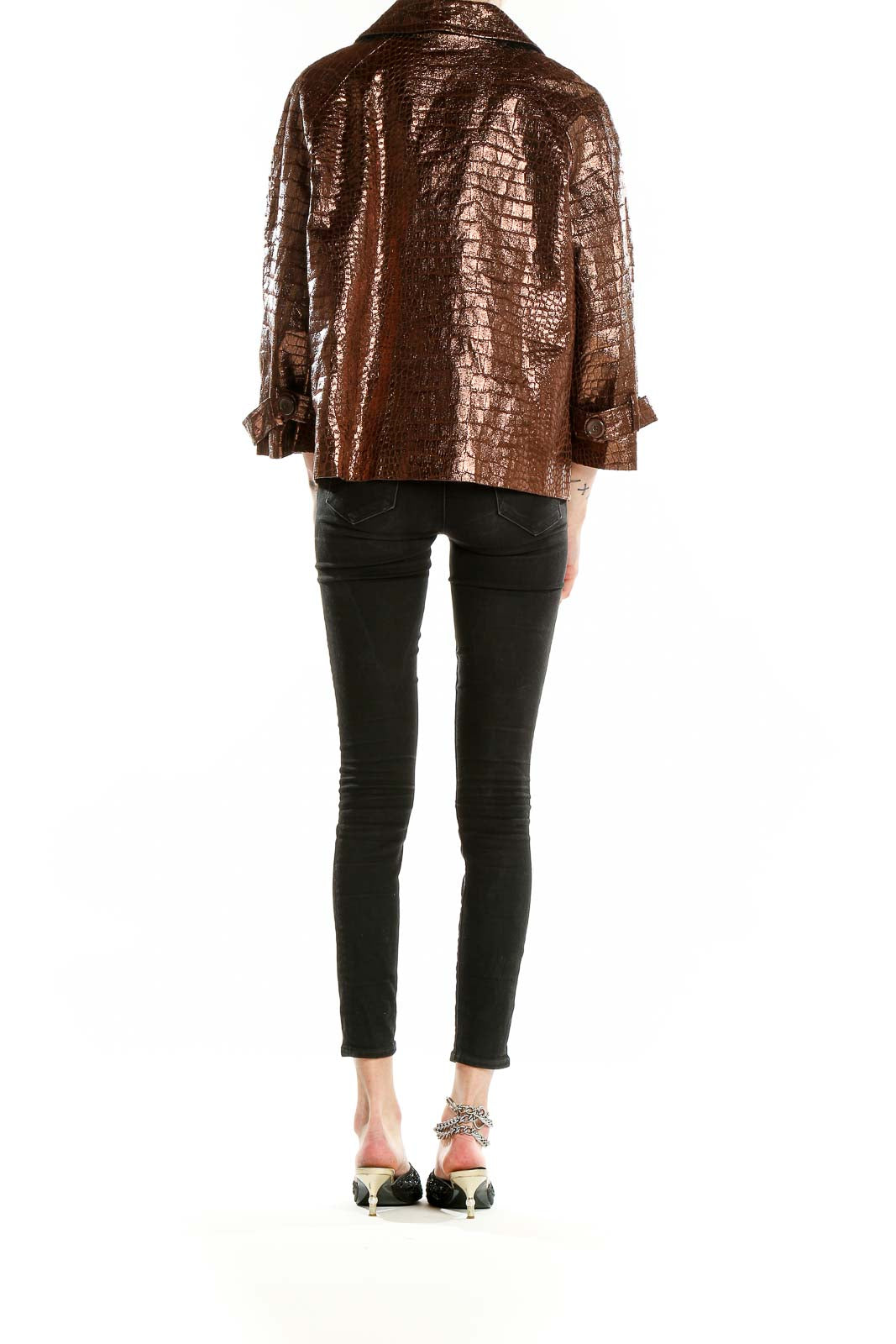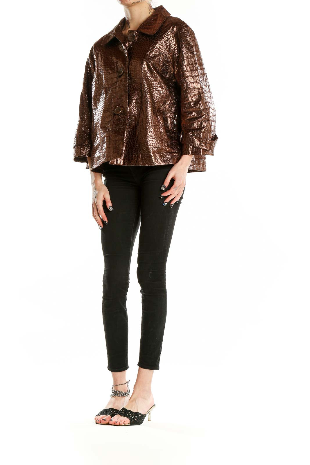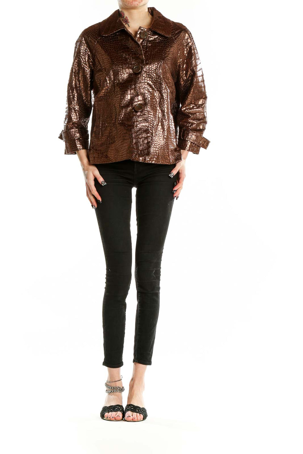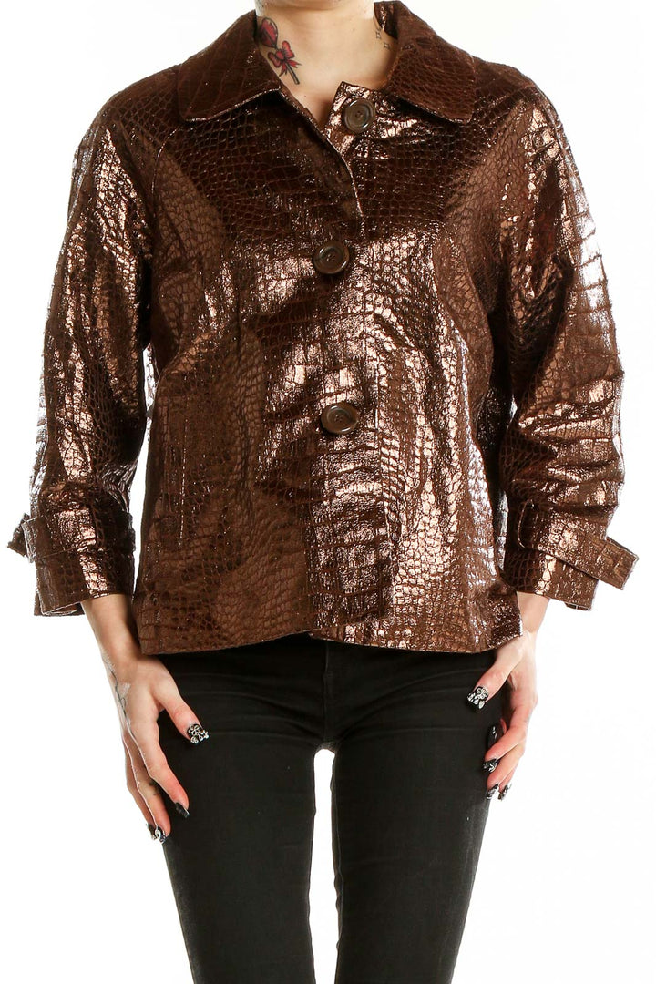Make a statement with this eye-catching bronze metallic crocodile-textured jacket from Birch Hill. This stunning piece features a unique, shimmering finish that catches the light beautifully, creating a luxurious and head-turning look. The crocodile-inspired texture adds depth and intrigue to the design, elevating it from a simple jacket to a true fashion statement.