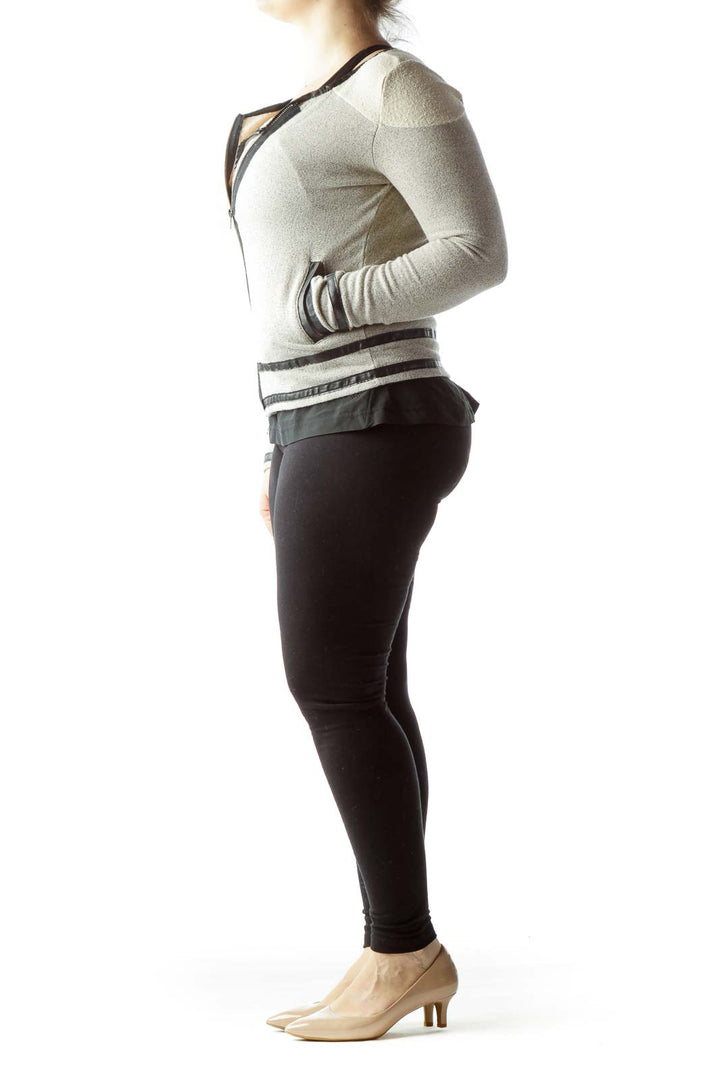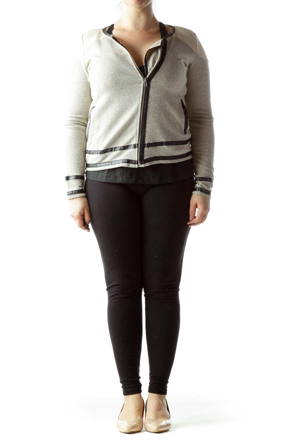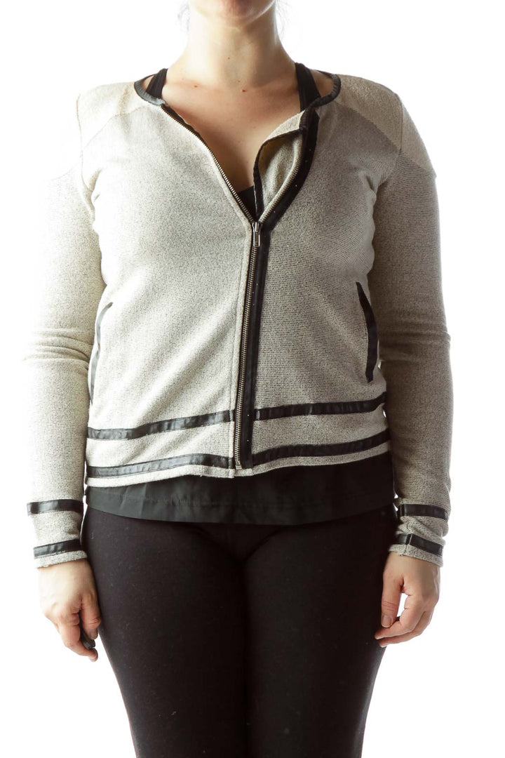Elevate your casual wardrobe with this sophisticated beige zip-up cardigan from Jack. Crafted with a soft, textured fabric, this versatile piece offers both style and comfort. The cardigan features a sleek full-length zipper closure and is beautifully accented with contrasting dark trim along the edges and hem. Stylish striped detailing adorns the lower portion and cuffs, adding a touch of visual interest to this otherwise classic design. The raglan sleeves provide a comfortable fit, while the ribbed cuffs and hem ensure a polished look. In excellent condition, this cardigan is perfect for layering over your favorite tops or wearing on its own for a put-together appearance. With its neutral beige color and thoughtful design elements, this Jack cardigan is sure to become a staple in your everyday wardrobe.