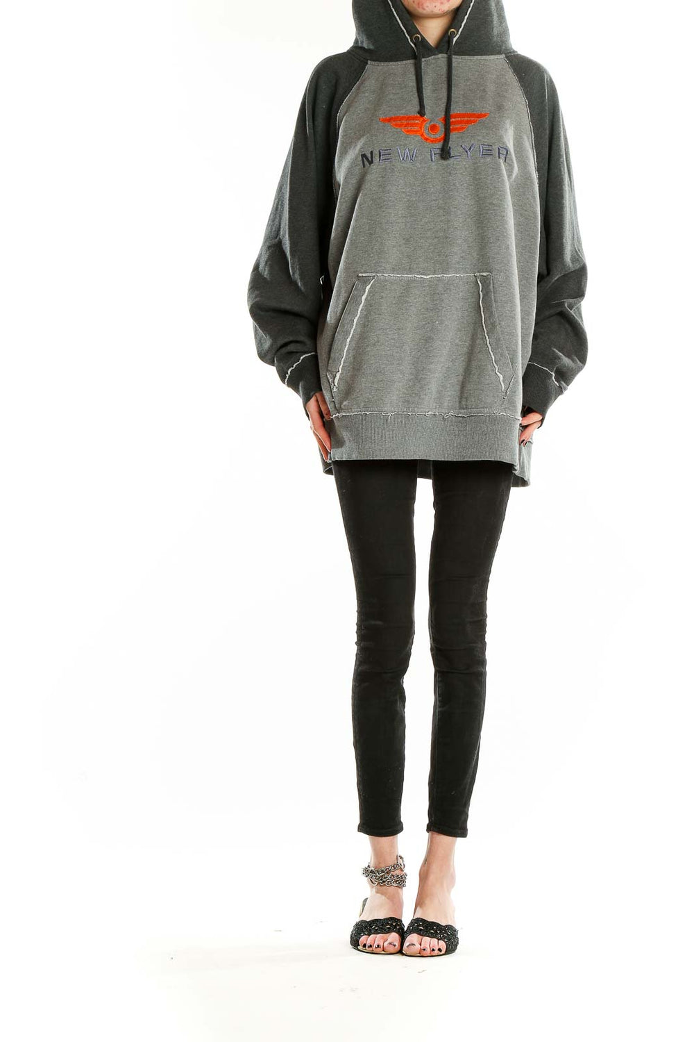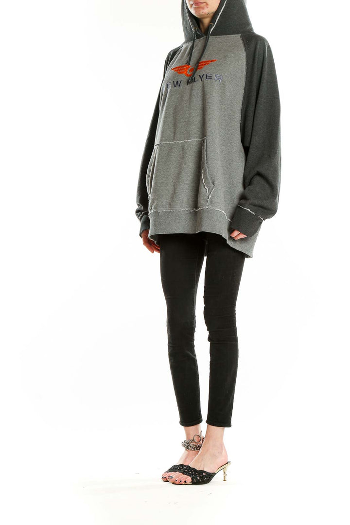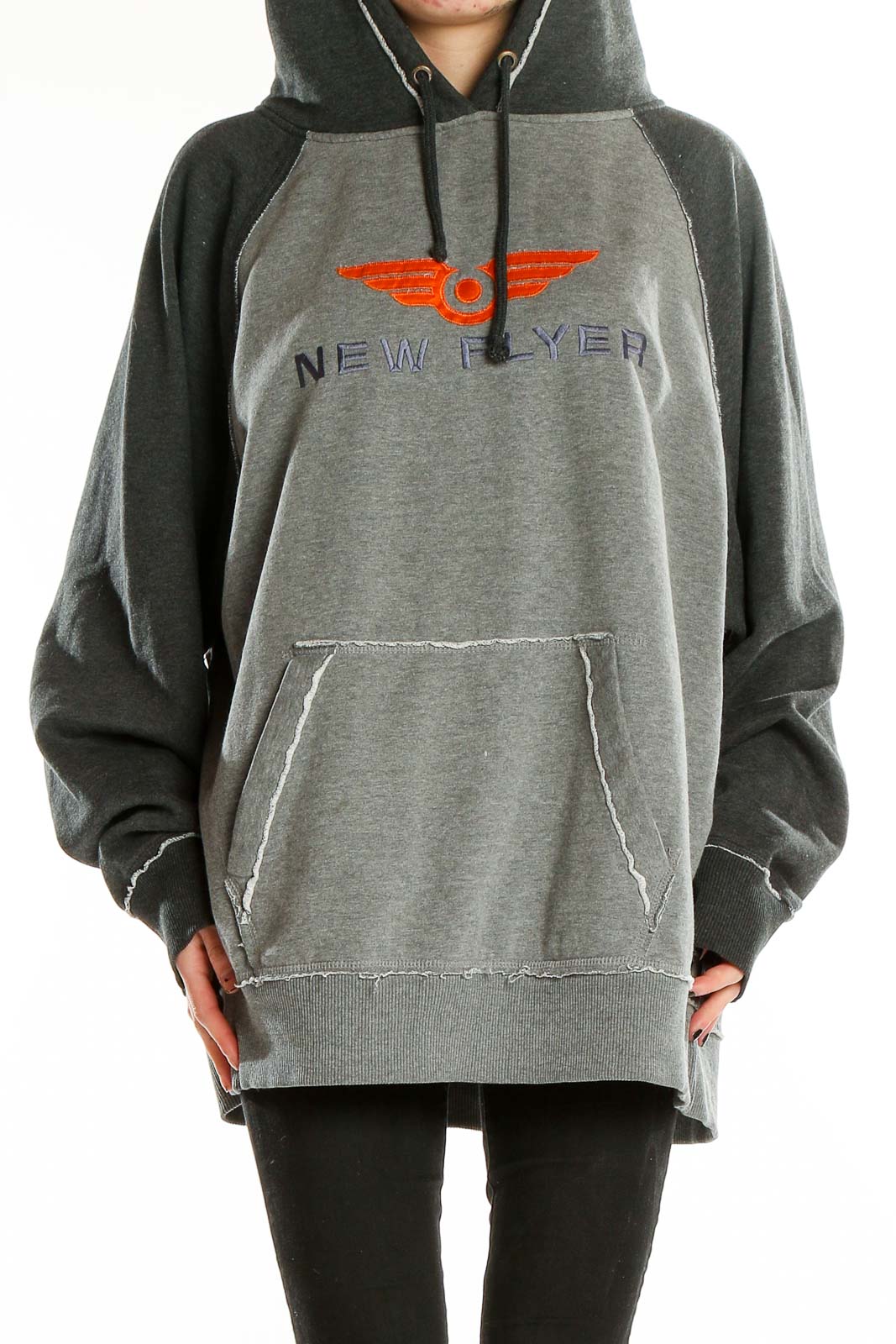 Stay cozy and stylish in this oversized gray hoodie from J.America. Featuring a bold orange and purple 'New Flyer' graphic on the chest, this hoodie combines comfort with a trendy streetwear aesthetic. The two-tone design with a lighter gray body and darker gray sleeves and hood adds visual interest.