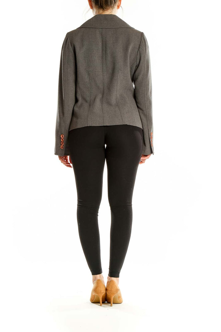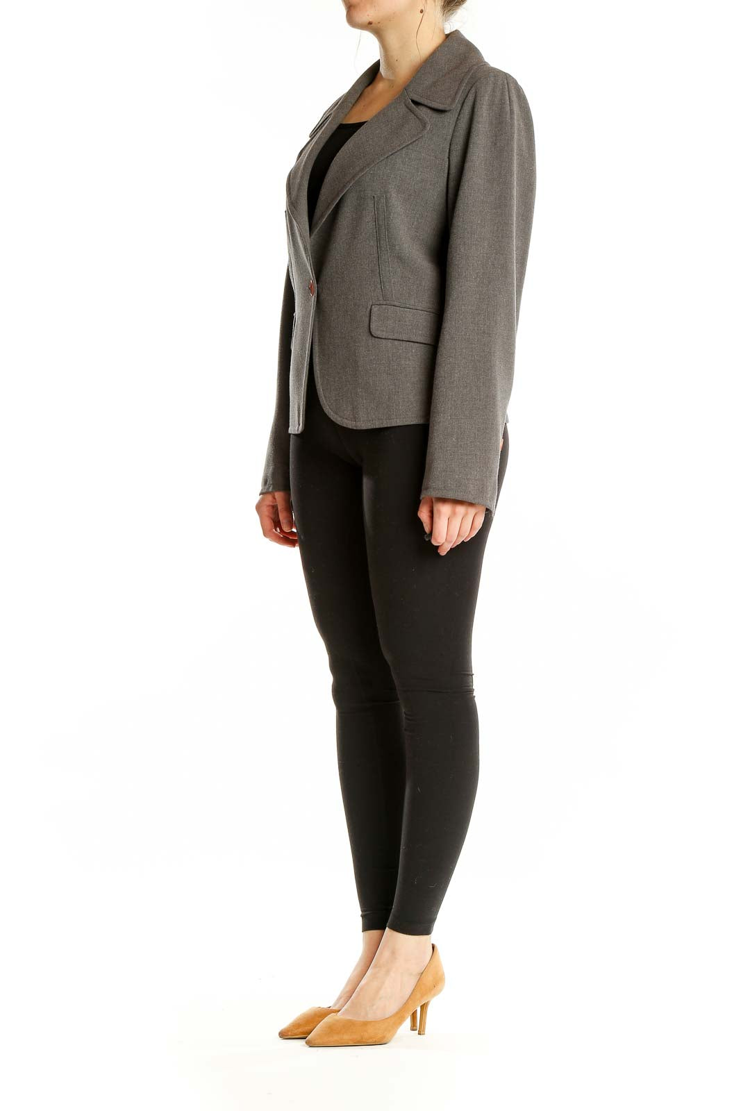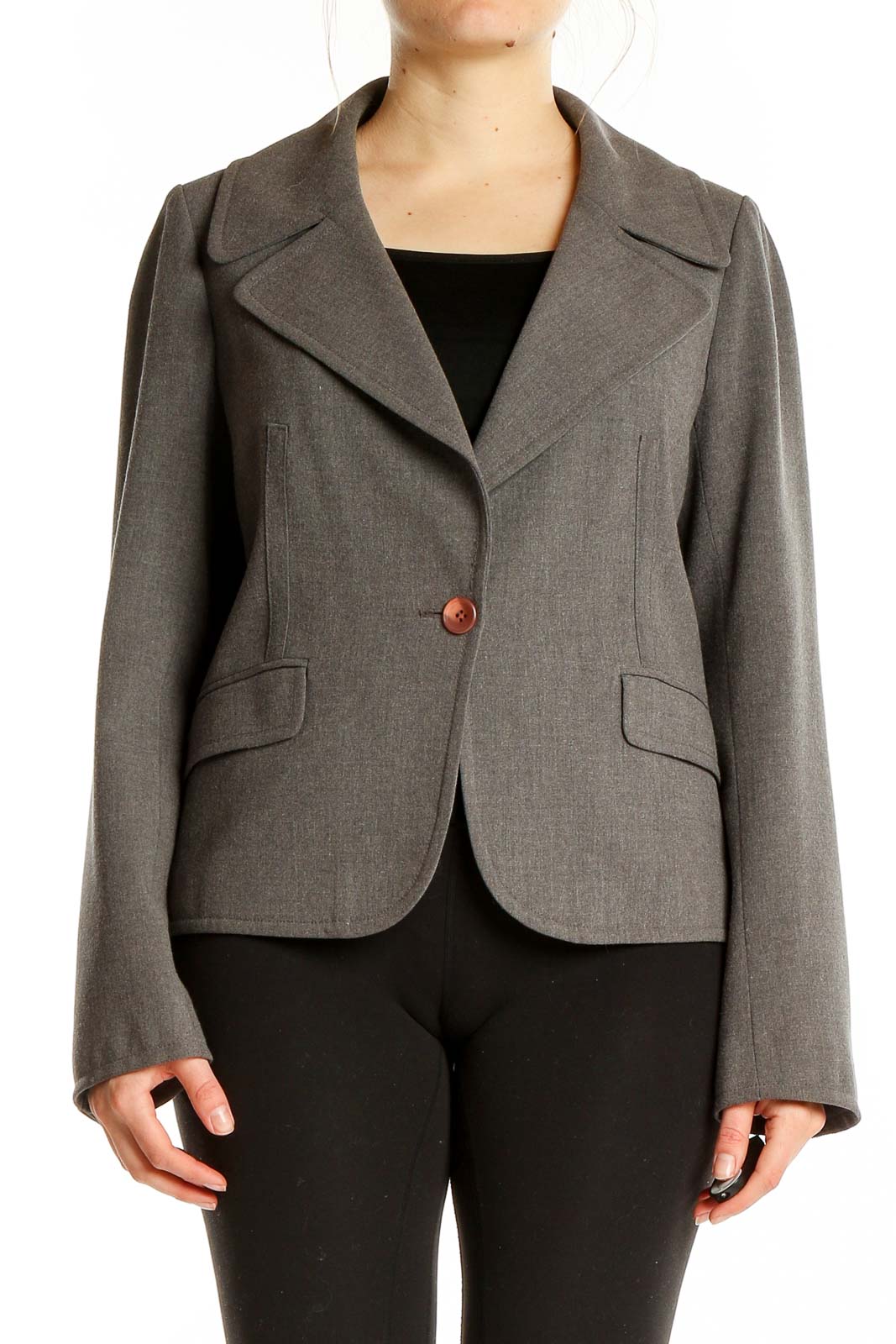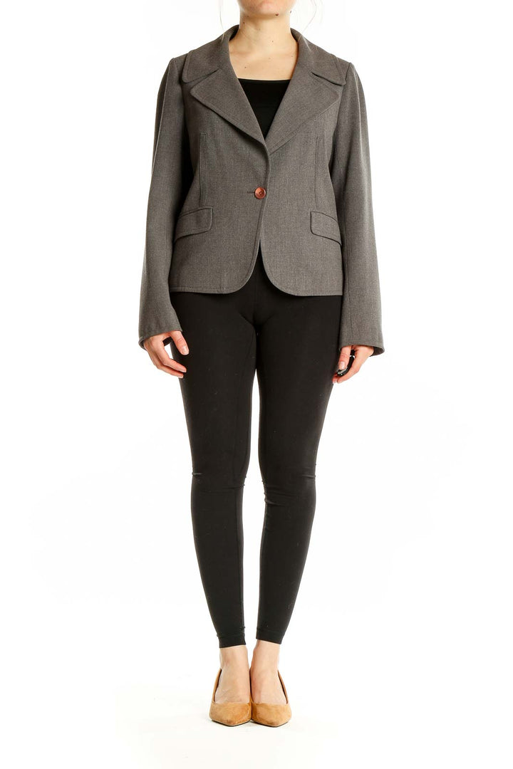 Elevate your professional wardrobe with this sophisticated gray blazer from JÔN. Crafted from a luxurious blend of polyester, polyurethane, and viscose, this jacket offers both comfort and style. The tailored silhouette features a single-button closure, creating a sleek and modern look perfect for the office or formal occasions. Wide lapels add a touch of classic elegance, while the front flap pockets provide both functionality and style. The blazer's excellent condition ensures you'll make a polished impression every time you wear it. With its versatile gray hue, this JÔN blazer easily pairs with a variety of outfits, making it a must-have addition to your closet.
