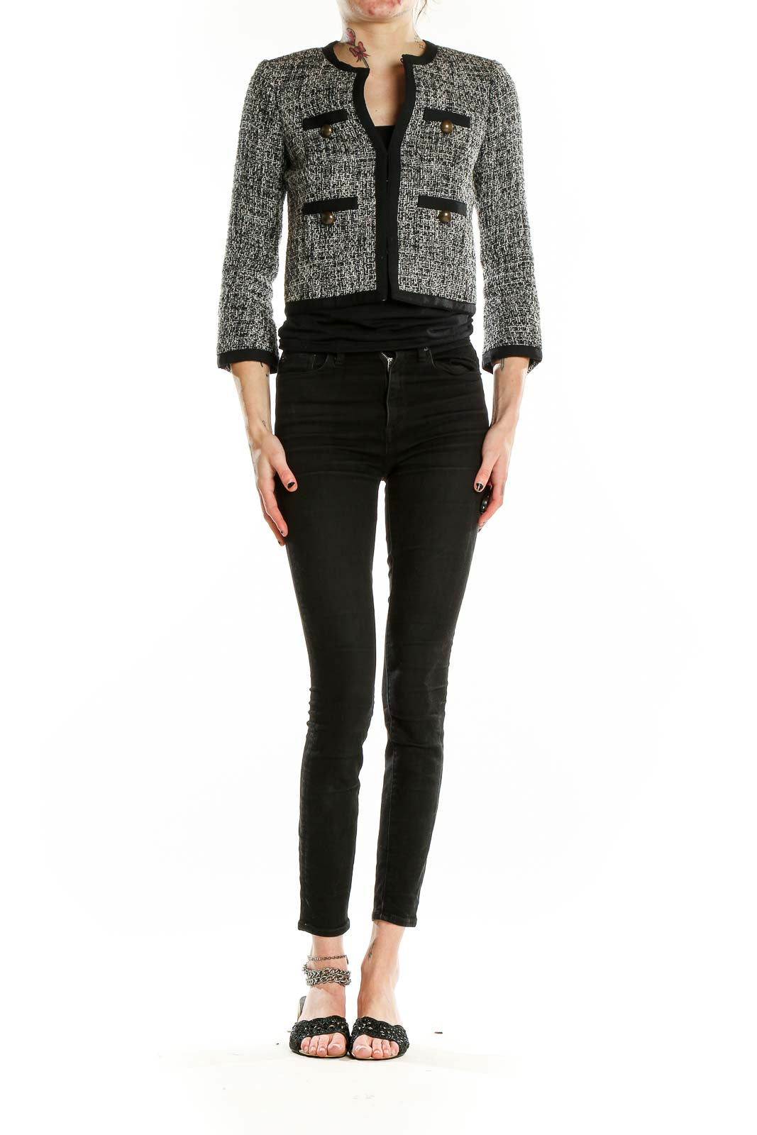 Elevate your wardrobe with this sophisticated gray tweed cropped jacket from J.Crew. This chic piece features a classic collarless design with a sleek open front, perfect for layering over your favorite outfits. The jacket's textured tweed fabric in a versatile gray and black pattern adds a touch of timeless elegance to any ensemble.