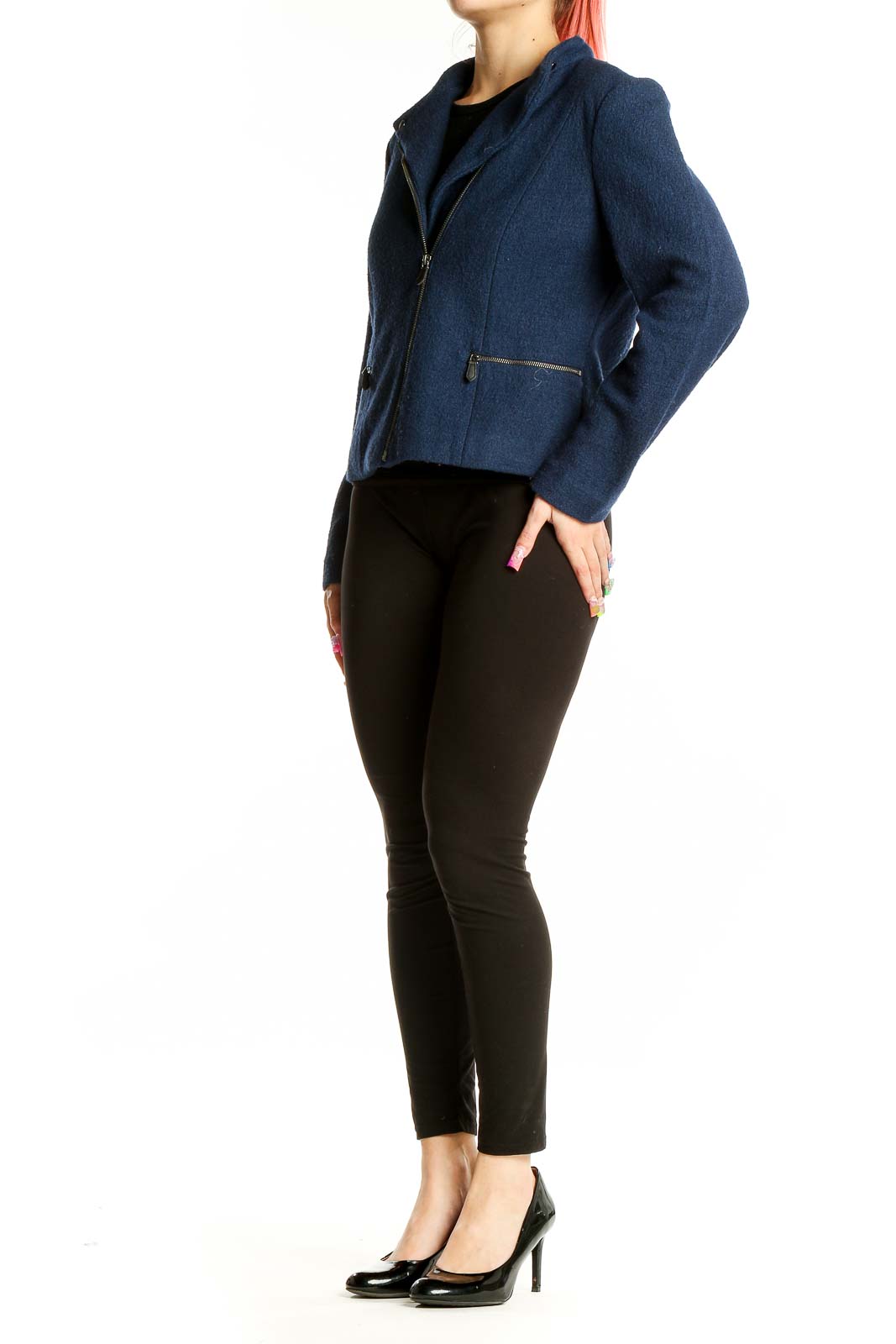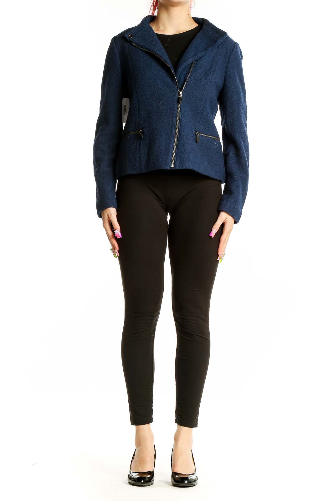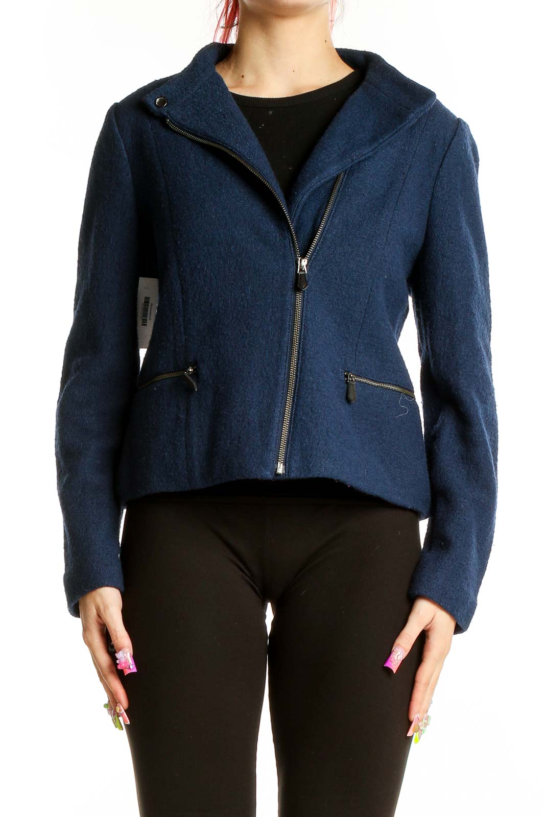 Elevate your outerwear collection with this sophisticated navy moto jacket from Talbots. Crafted from a luxurious blend of rayon and wool, this jacket offers both warmth and style for the fashion-conscious woman. The sleek asymmetrical zipper and stand-up collar add a modern edge to the classic silhouette, while the fitted design accentuates your figure beautifully.