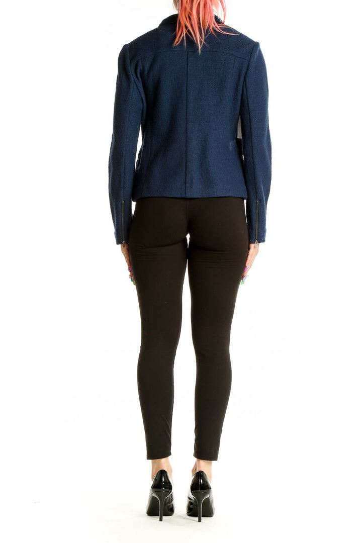 The jacket's measurements (Bust 38", Hips 36", Length 22", Waist 34") ensure a flattering fit for a size Small. Whether paired with jeans for a casual look or draped over a dress for a night out, this navy moto jacket is sure to become your go-to piece for effortless style.