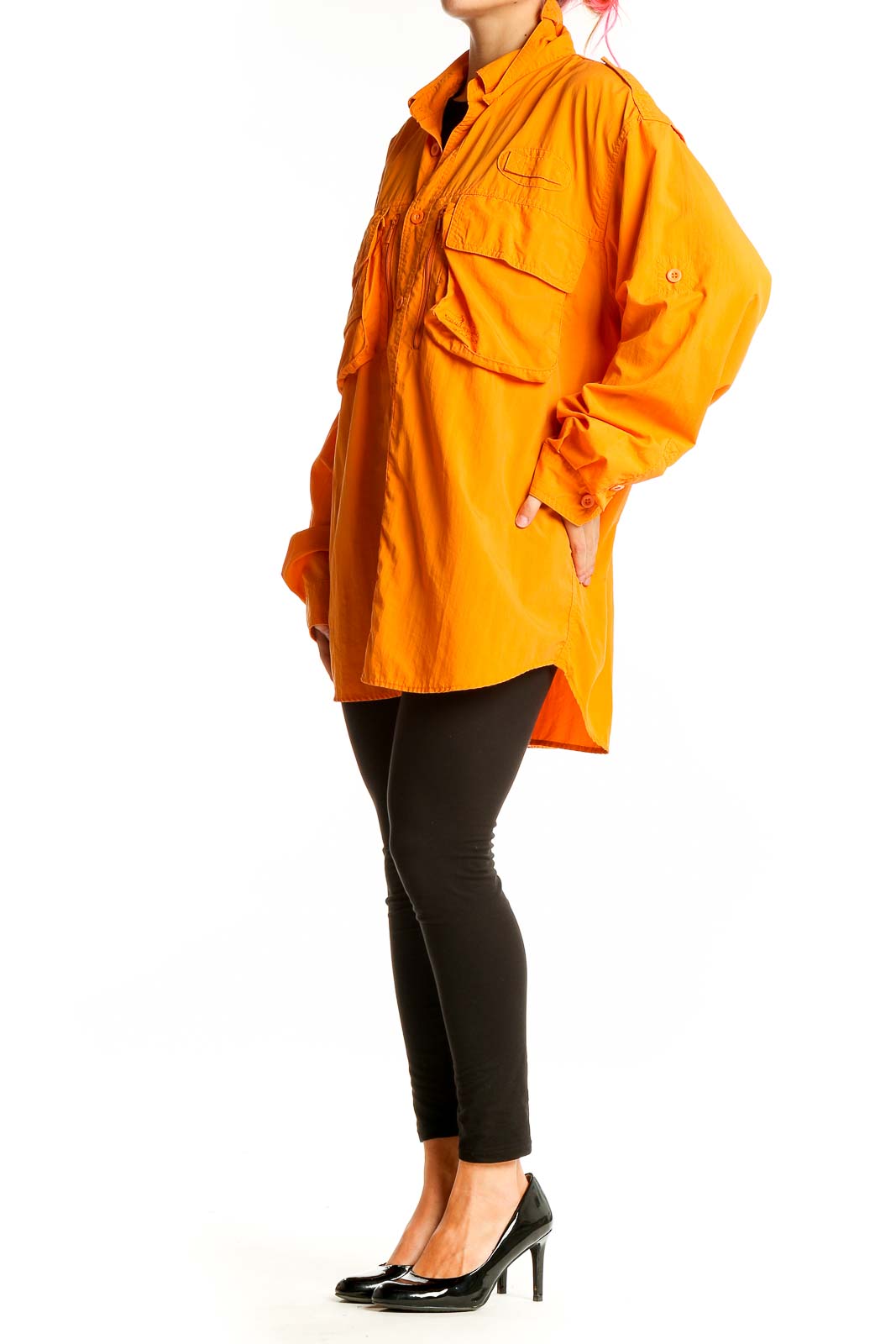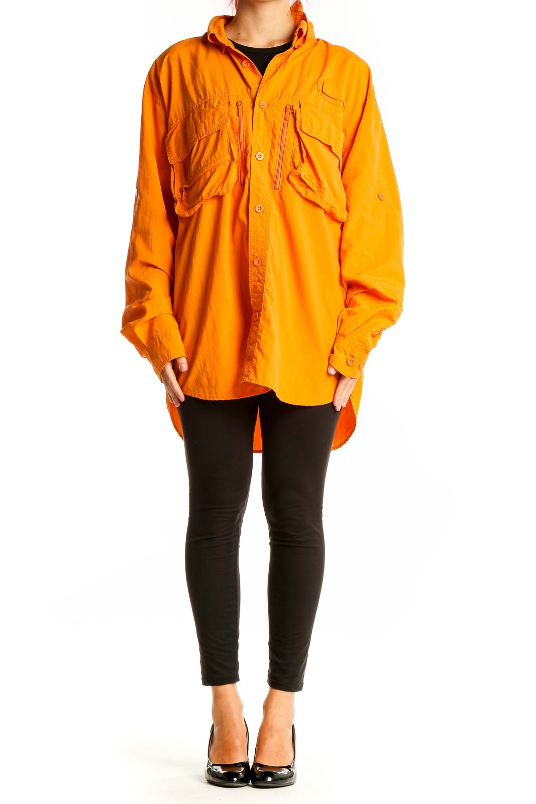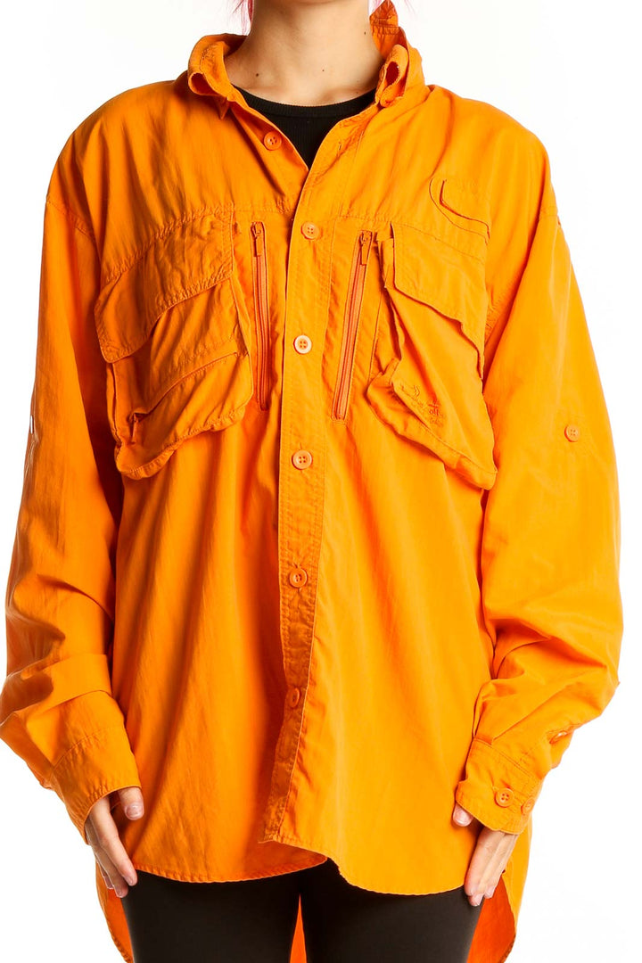 Front view of Cabela's orange nylon utility jacket with multiple pockets