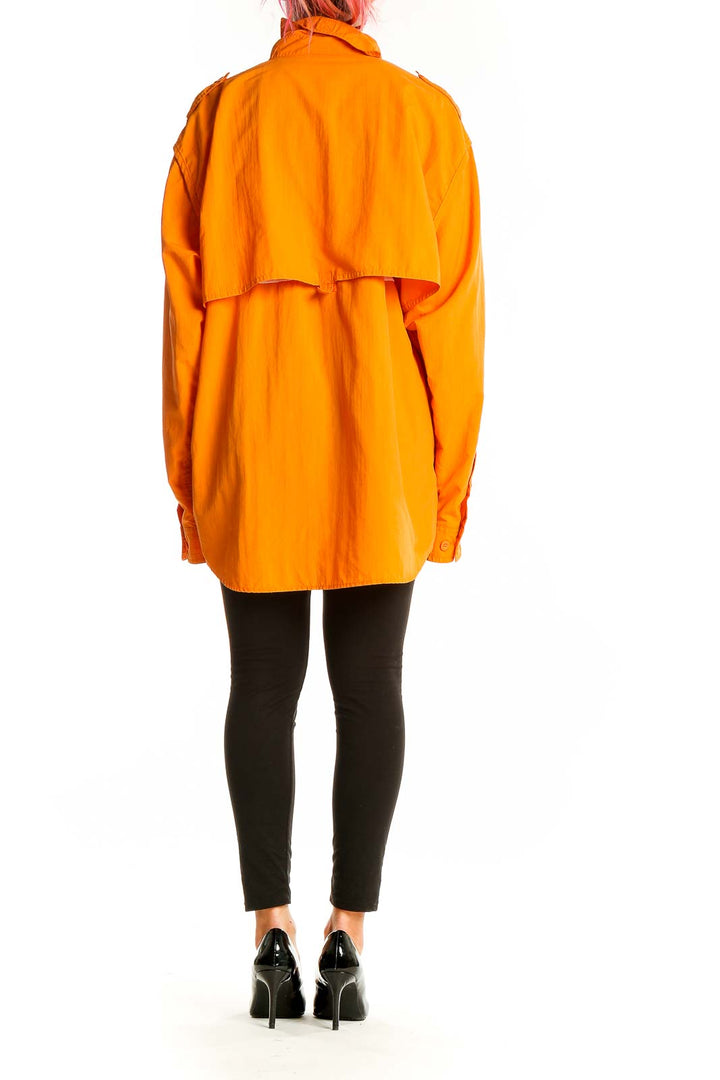 Back view of Cabela's orange nylon utility jacket showing oversized fit and rear yoke