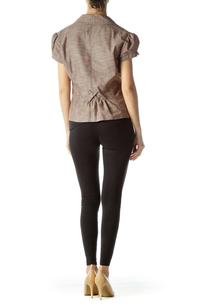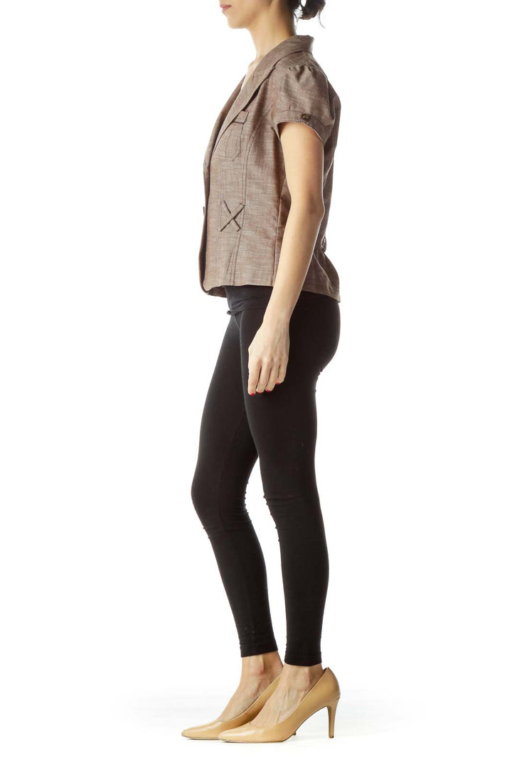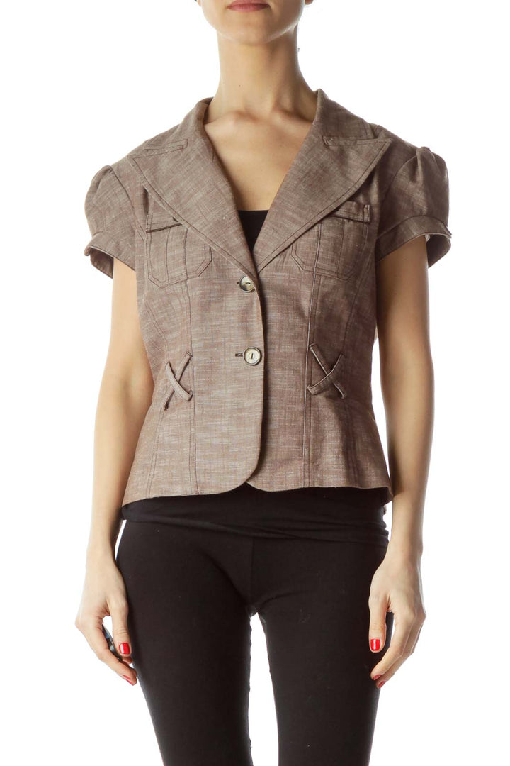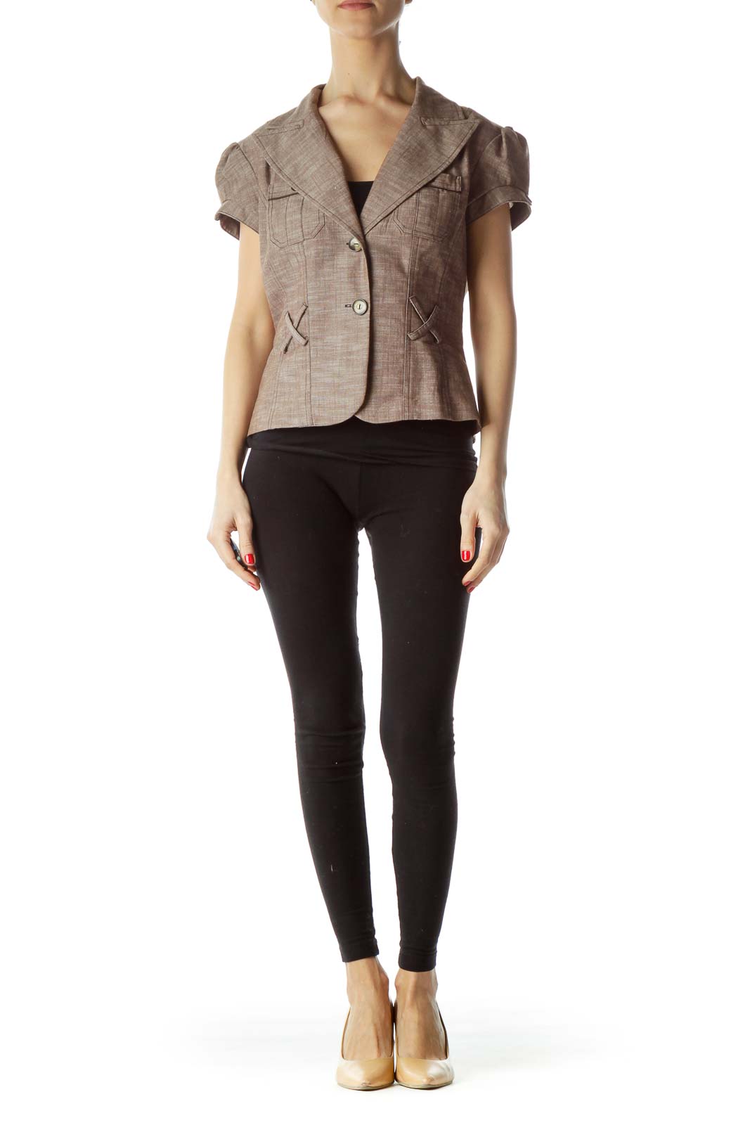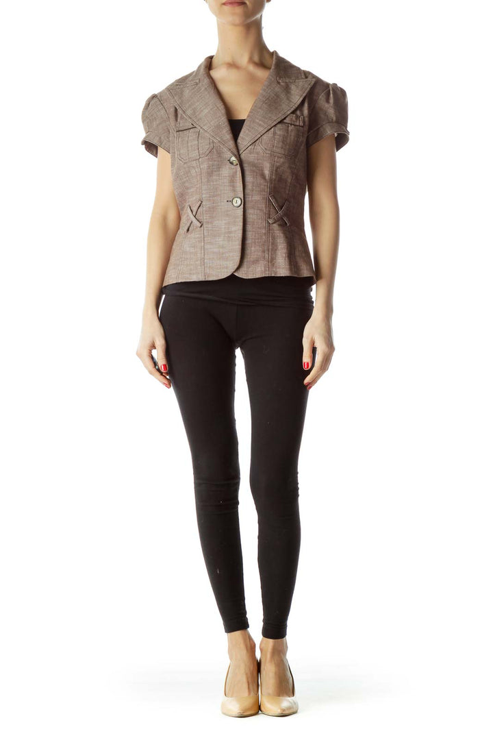 Elevate your professional wardrobe with this sophisticated taupe short-sleeve blazer by A. byer. Crafted with a tailored fit, this jacket features a classic lapel collar and a two-button closure for a polished look. The short puff sleeves add a touch of feminine flair, while the front pockets provide both style and functionality. The textured fabric gives depth to the neutral taupe color, making it a versatile piece for various outfits. With its excellent condition and flattering silhouette, this blazer is perfect for the office or dressy casual events. The gathered detail at the back waist ensures a shapely fit, accentuating your figure beautifully.
