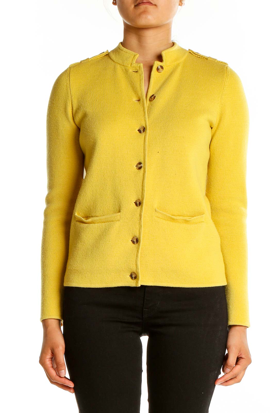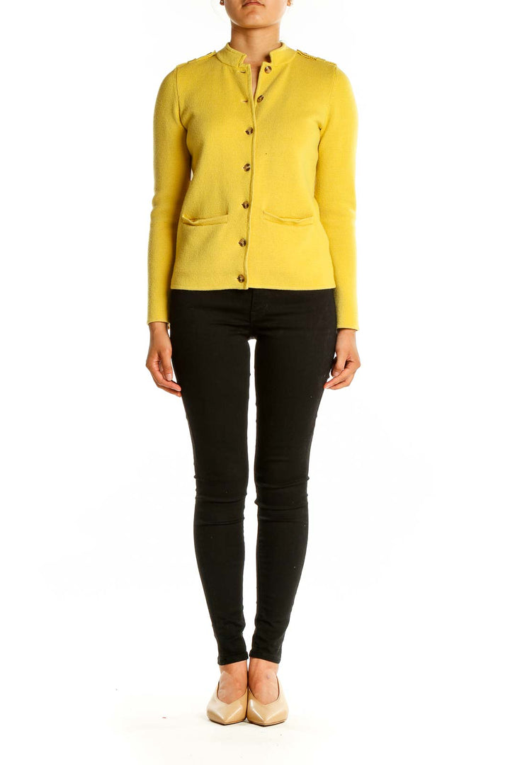 Elevate your wardrobe with this stunning yellow Merino wool cardigan from Talbots. This exquisite piece features a classic button-up design with a sophisticated mandarin collar, offering a modern twist on a timeless silhouette. The vibrant yellow hue adds a cheerful pop of color to any outfit, perfect for brightening up your look.