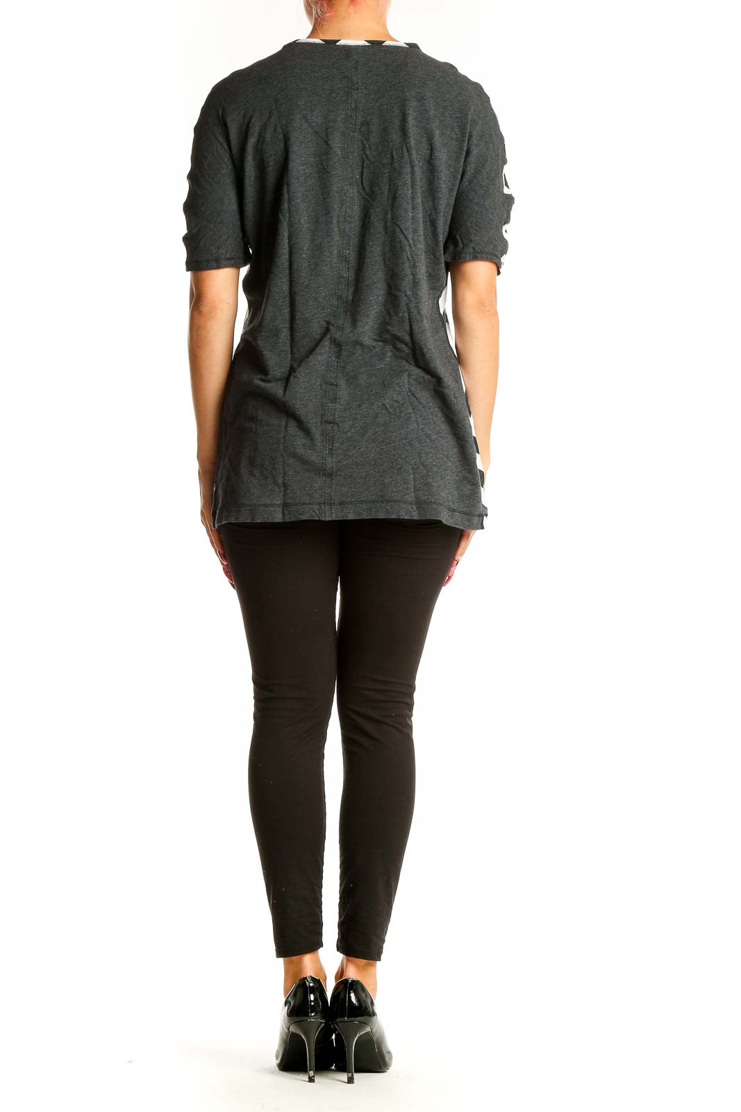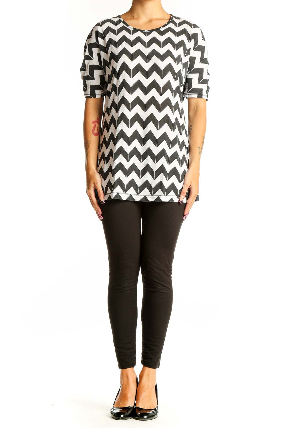 Make a bold statement with this eye-catching Lululemon top featuring a striking black and white chevron print. The short-sleeved design offers a comfortable fit for various activities, from casual outings to light workouts. The top's generous measurements (Bust 38", Length 28", Waist 36") ensure a relaxed, flattering silhouette that complements a variety of body types.