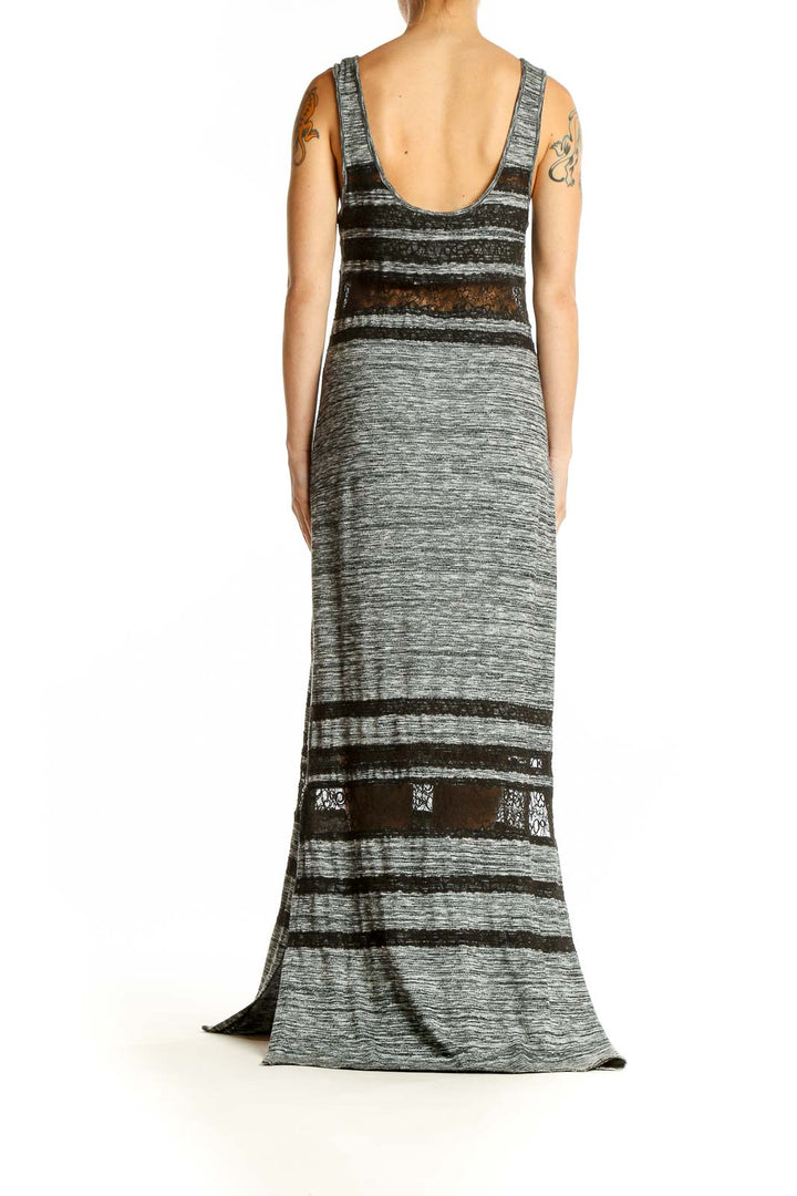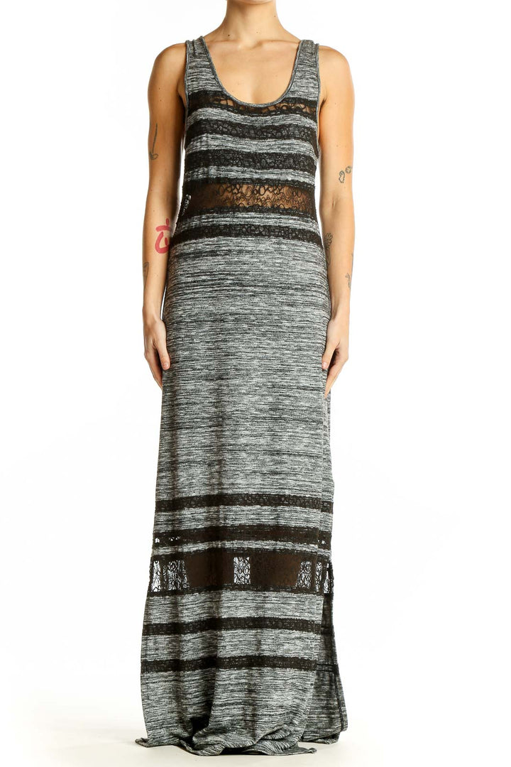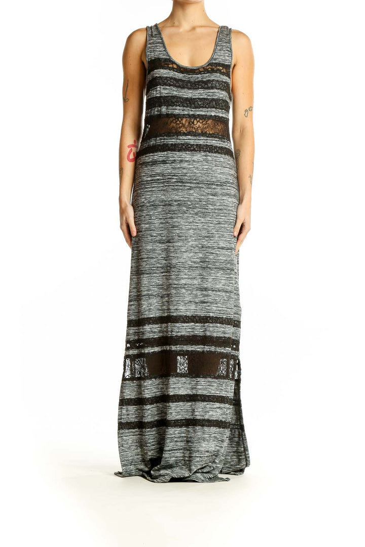 Make a statement in this stunning gray striped maxi dress from Free People. The heathered fabric creates a beautiful marled effect, while sheer lace insets add an alluring touch of romance. Featuring a scoop neckline and sleeveless design, this dress offers a flattering silhouette that's perfect for any occasion. The full-length skirt flows gracefully to the floor, with alternating solid and sheer striped panels creating visual interest. Crafted from a soft blend of polyester and rayon, this dress combines comfort with style. The excellent condition ensures you'll look and feel your best. Whether you're attending a summer wedding or enjoying a night out, this Free People maxi dress is sure to turn heads.