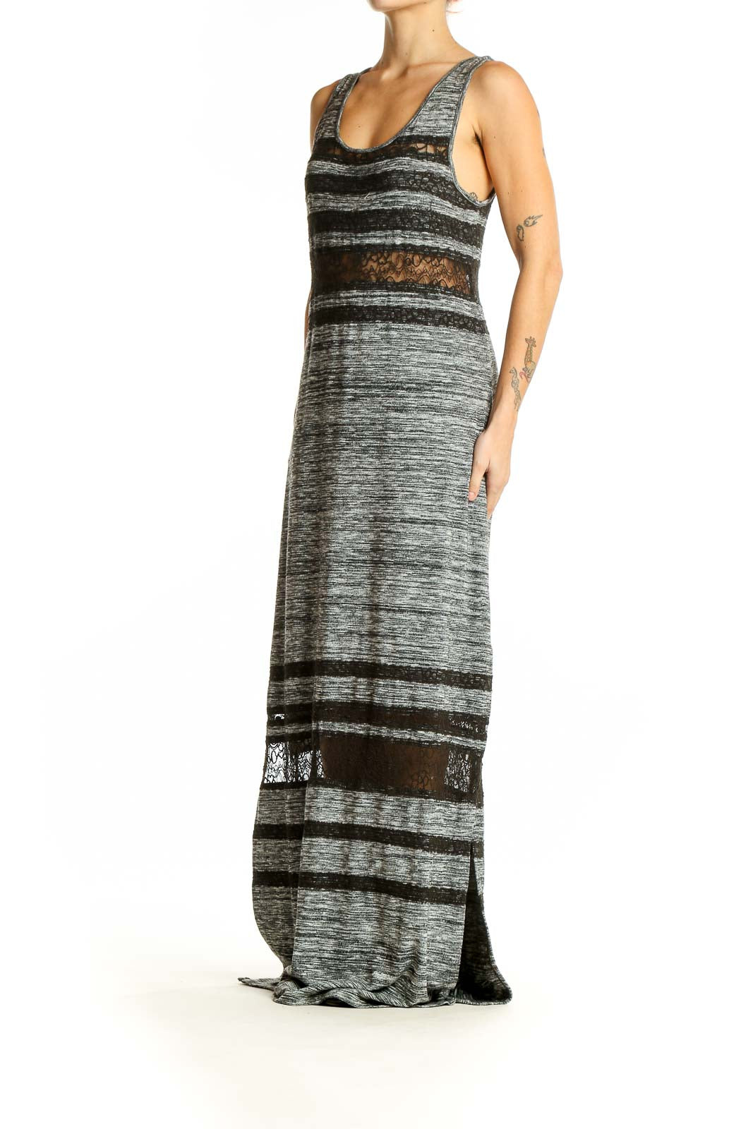 Side view of Free People gray striped maxi dress showing full length and lace details