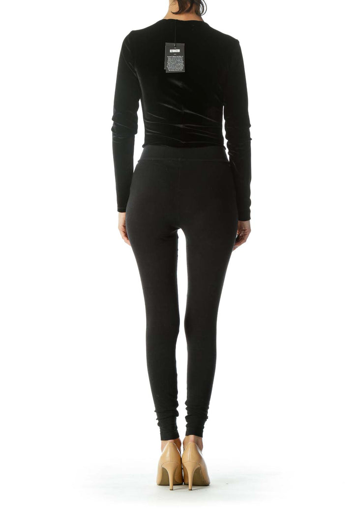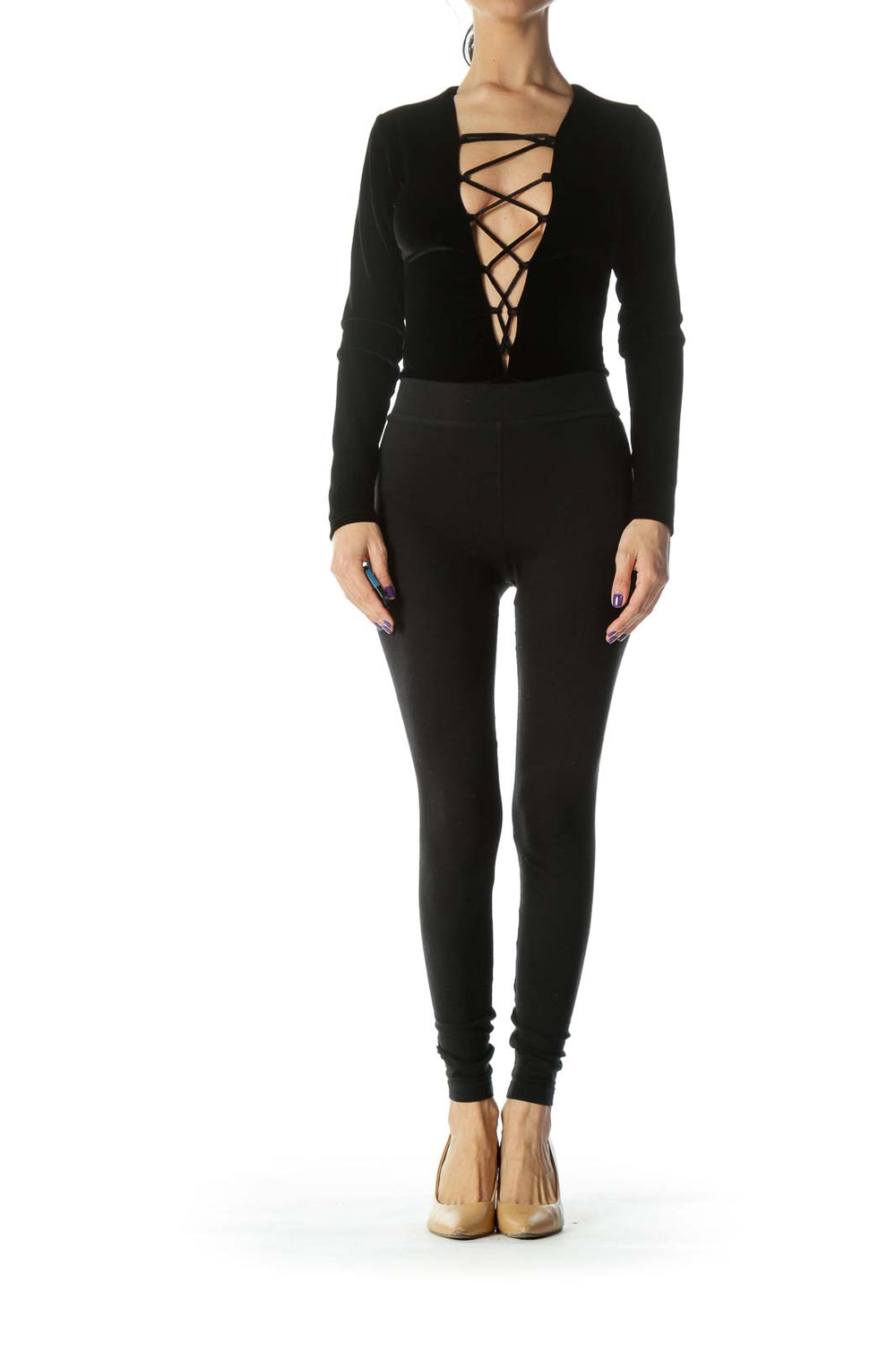 Black Velvet Recycled-Fabric Lace-up Long-Sleeve Body-Suit