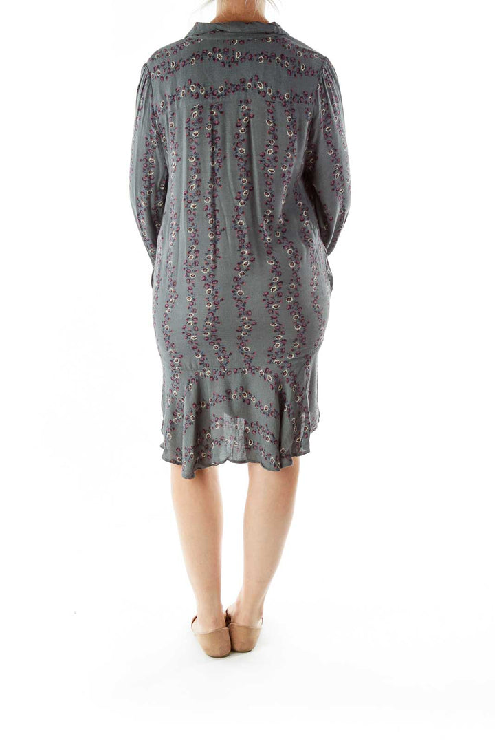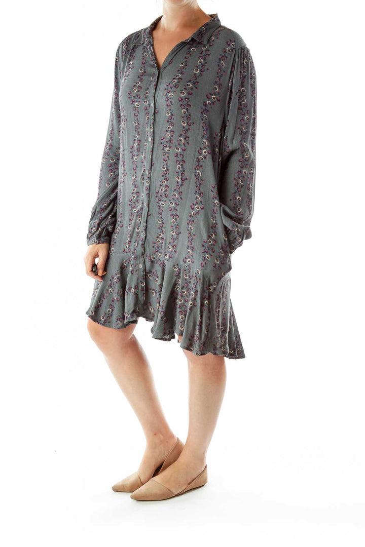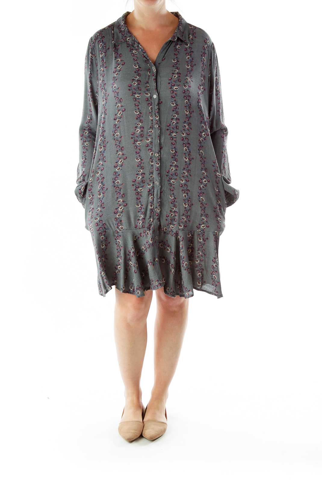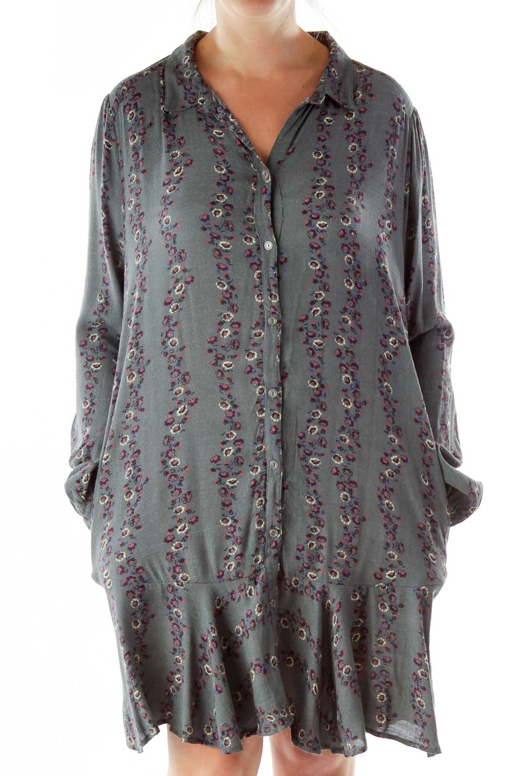 Embrace effortless style with this charming gray floral shirt dress from Free People. The soft, flowing fabric features delicate purple and white floral patterns arranged in vertical stripes, creating a flattering and elongating effect. The button-down front and collared neckline add a classic touch, while the relaxed fit and knee-length cut offer versatility for various occasions. Long sleeves with loose cuffs provide comfort and adjustability. The dress is finished with a subtle ruffle hem, adding a feminine flair to this bohemian-inspired piece. In excellent condition, this size Large dress is perfect for those seeking a comfortable yet fashionable addition to their wardrobe.