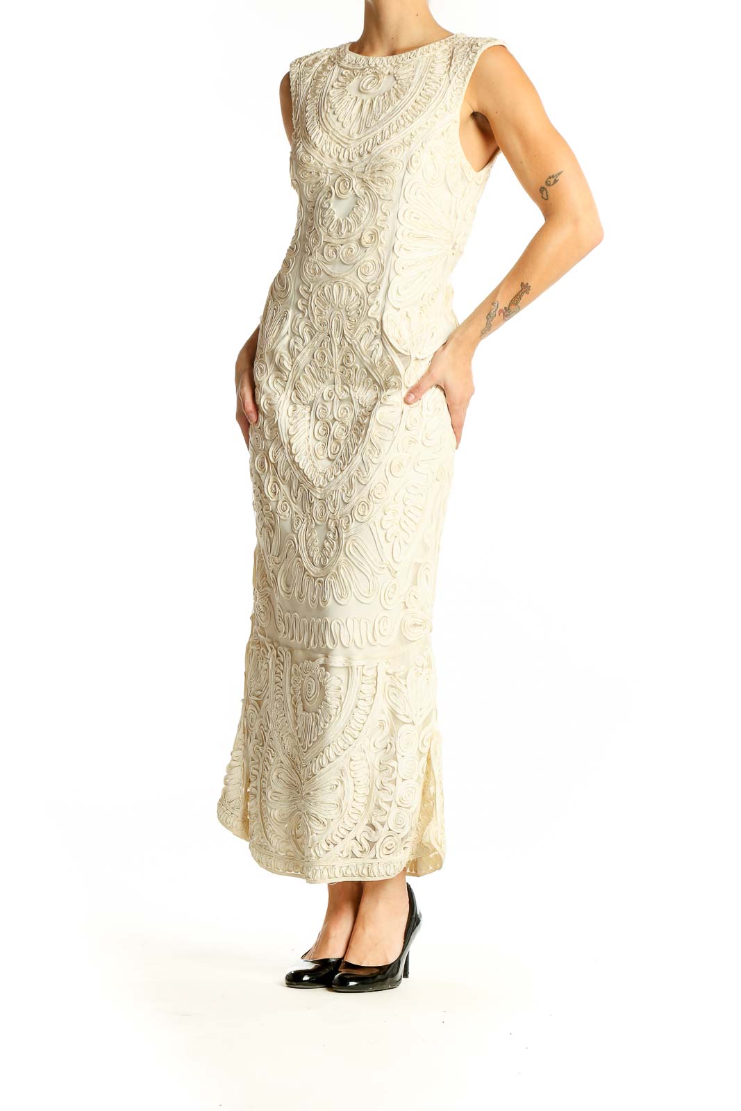 Make a stunning entrance in this exquisite ivory embroidered lace maxi dress by JS Collections. This elegant piece features an intricate all-over lace pattern with beautiful floral and swirl designs, creating a romantic and sophisticated look. The sleeveless silhouette and high neckline offer a classic touch, while the form-fitting bodice gracefully flows into a floor-length skirt with a subtle mermaid flare.