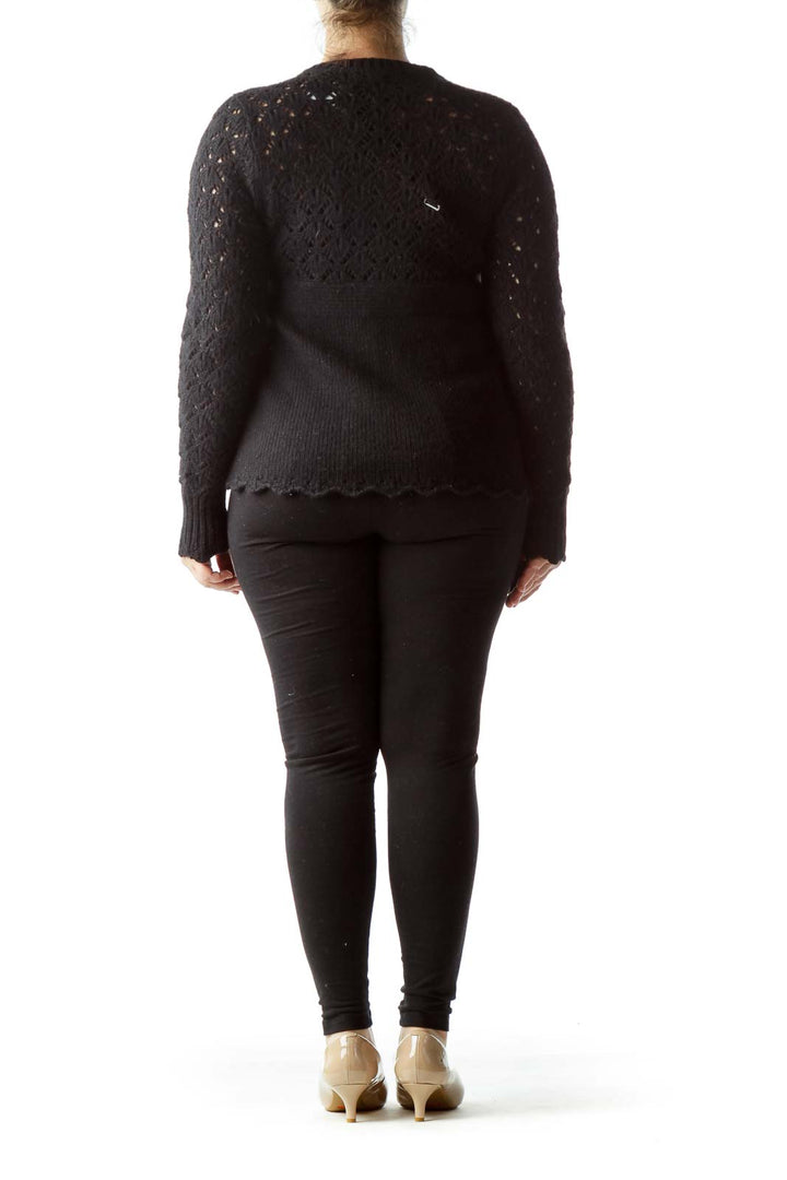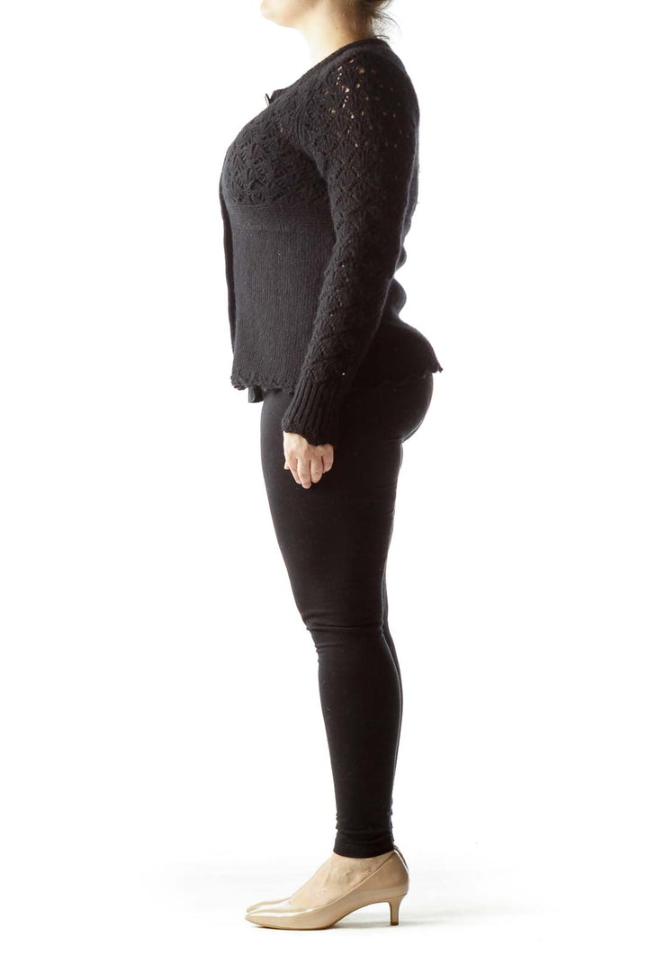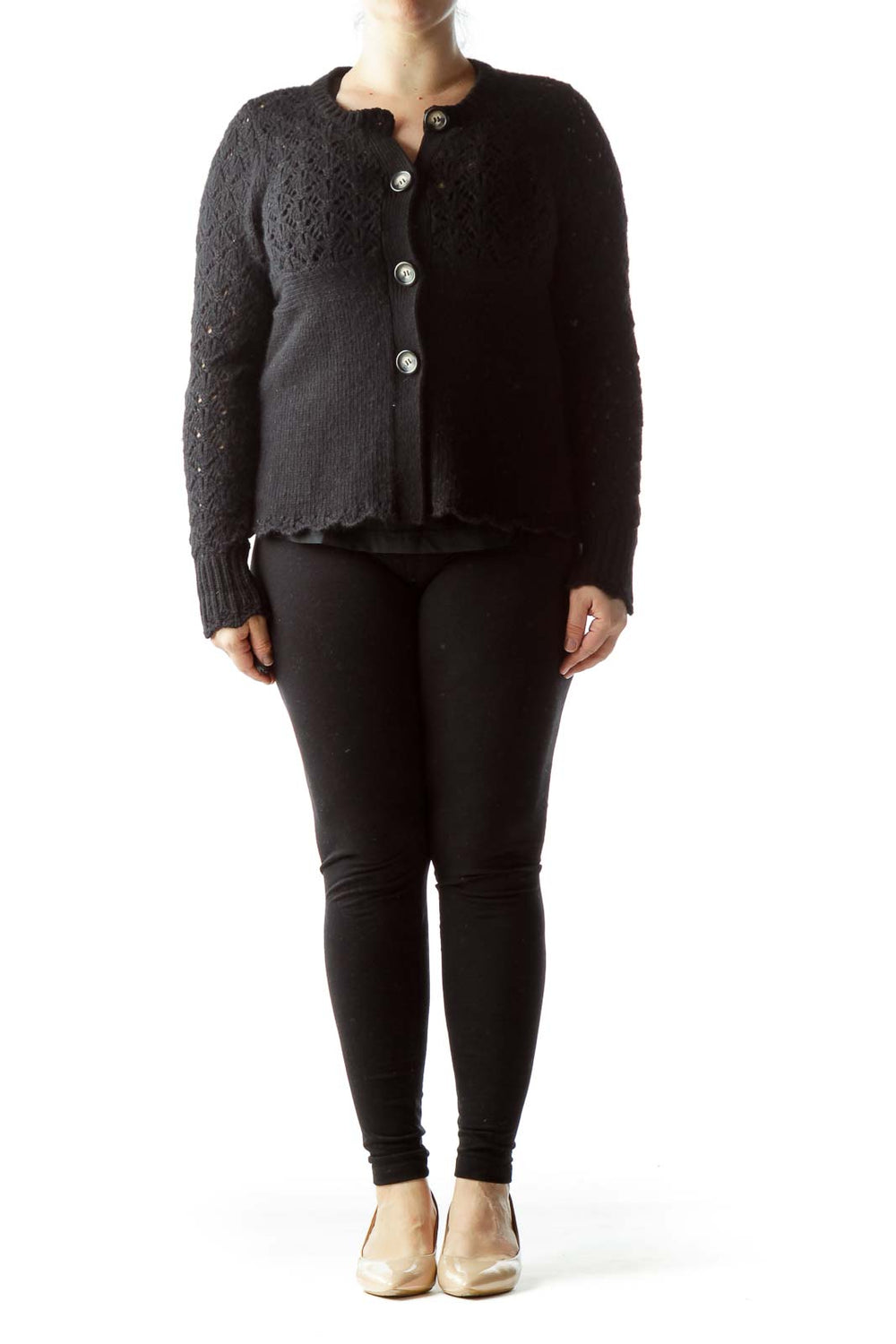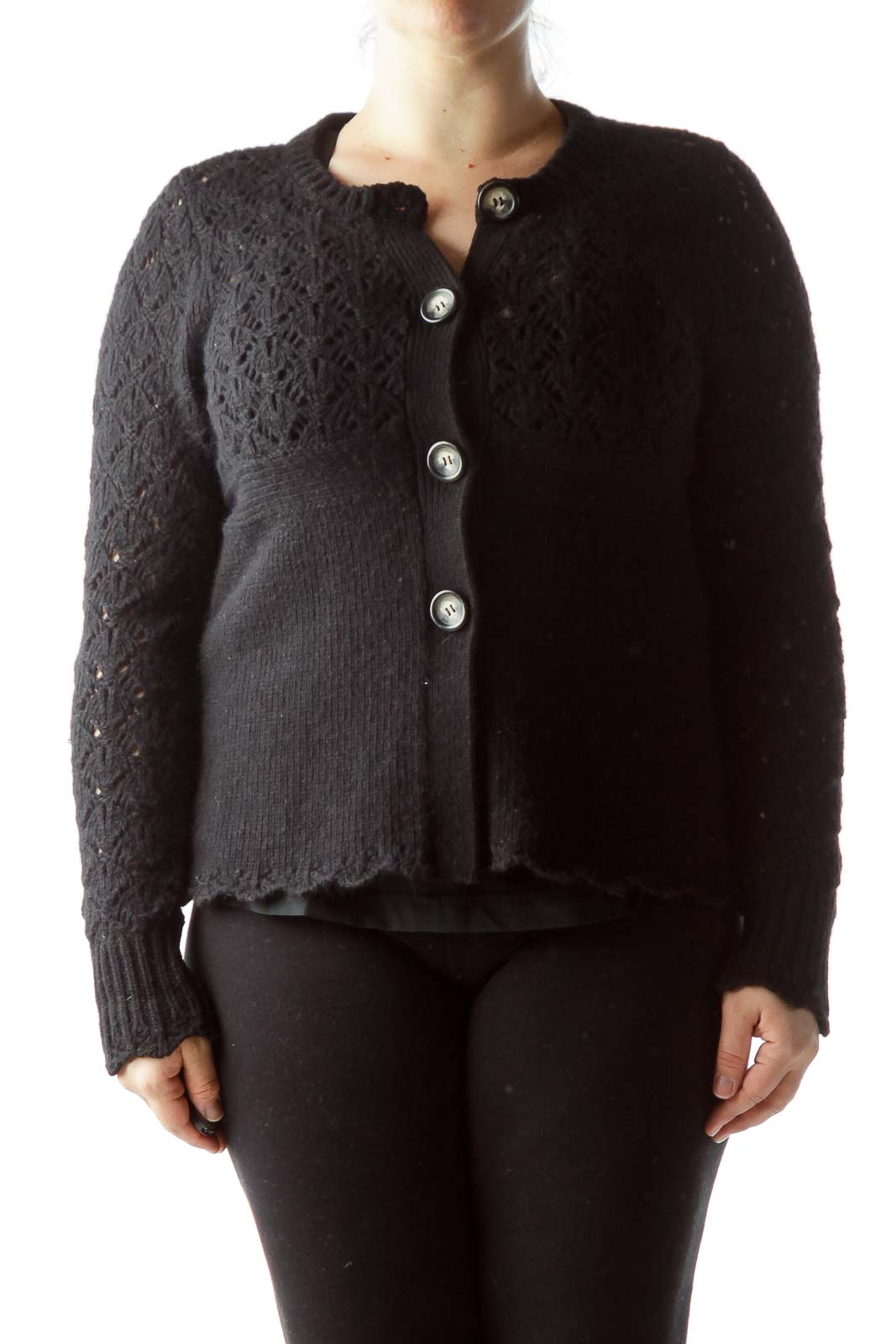 Elevate your wardrobe with this exquisite black knit cardigan from Juicy Couture. Featuring a stunning lace pattern throughout the sleeves and upper body, this piece effortlessly blends elegance with comfort. The cardigan boasts a classic button-front closure with four stylish silver-toned buttons, adding a touch of sophistication to its design.