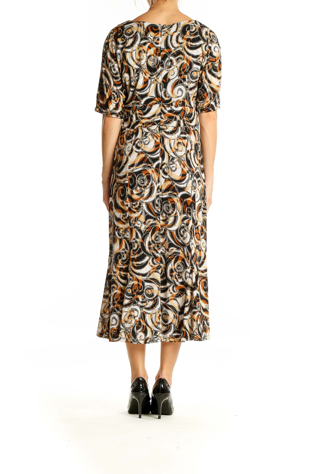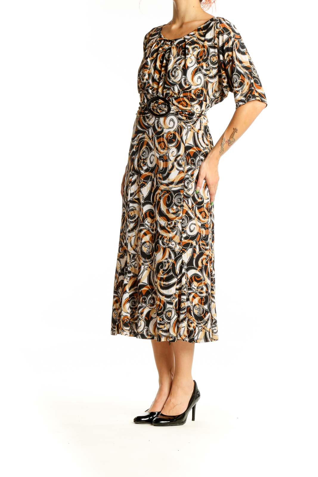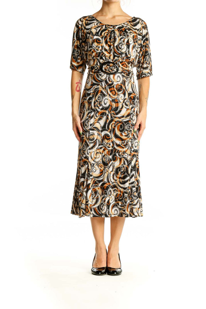Make a statement with this eye-catching Black and Orange Swirl Print Midi Dress from Julian Taylor. The dress features a captivating abstract swirl pattern in shades of black, orange, and white, creating a bold and dynamic look. Crafted from a comfortable blend of polyester and spandex, this dress offers both style and ease of movement.