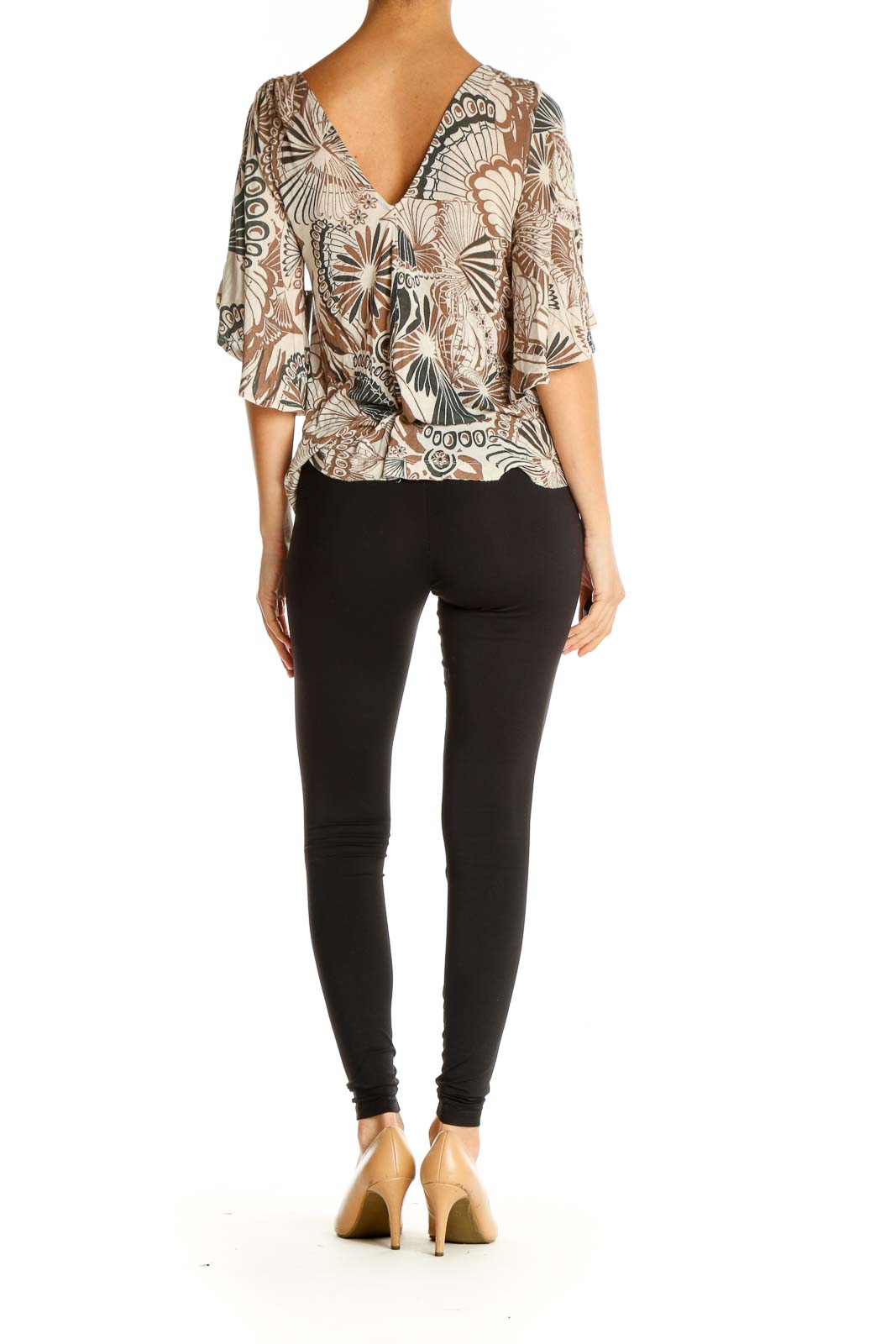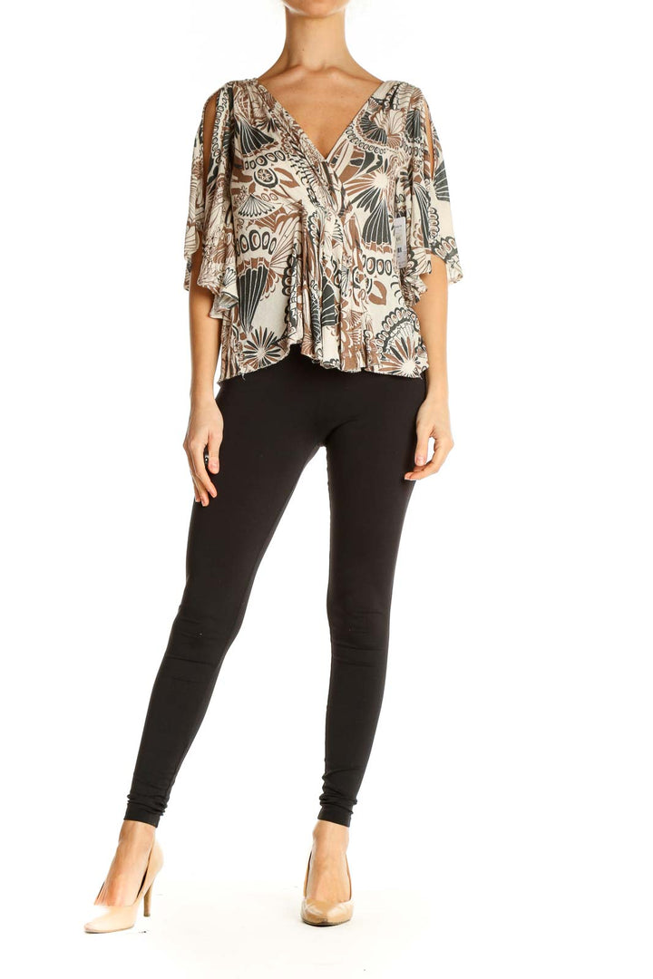 Elevate your style with this enchanting beige floral print top from Free People. The delicate V-neckline and fluttery short sleeves create a romantic silhouette that's perfect for both casual outings and dressier occasions. The lightweight fabric features an eye-catching pattern of fan-like floral motifs in earthy tones of beige, brown, and sage green, adding a touch of bohemian flair to your wardrobe.