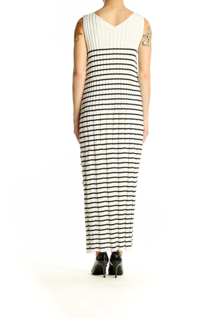 Elevate your summer wardrobe with this stunning white and black striped maxi dress by Qualite. This sleeveless beauty features a flattering V-neckline and a ribbed knit texture that adds a touch of sophistication to its casual charm. The vertical stripes elongate your silhouette, while the flowy, floor-length cut ensures both comfort and style.