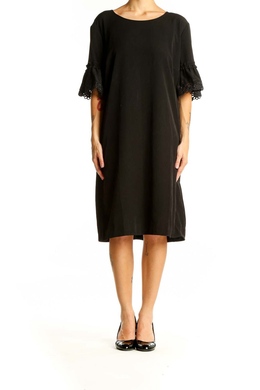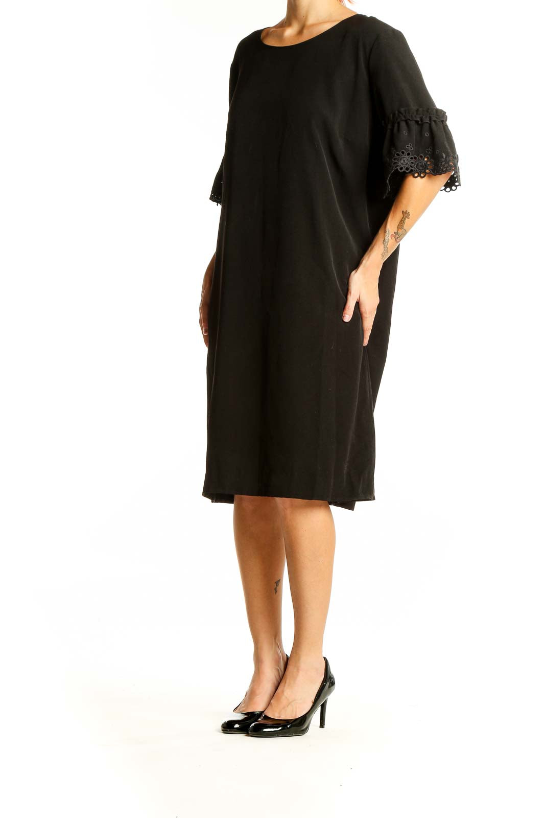 Elevate your wardrobe with this sophisticated black shift dress from Karl Lagerfeld. Crafted from smooth polyester, this dress offers both comfort and style for various occasions. The standout feature is the delicate lace detailing on the bell sleeves, adding a touch of romance and femininity to the classic silhouette.