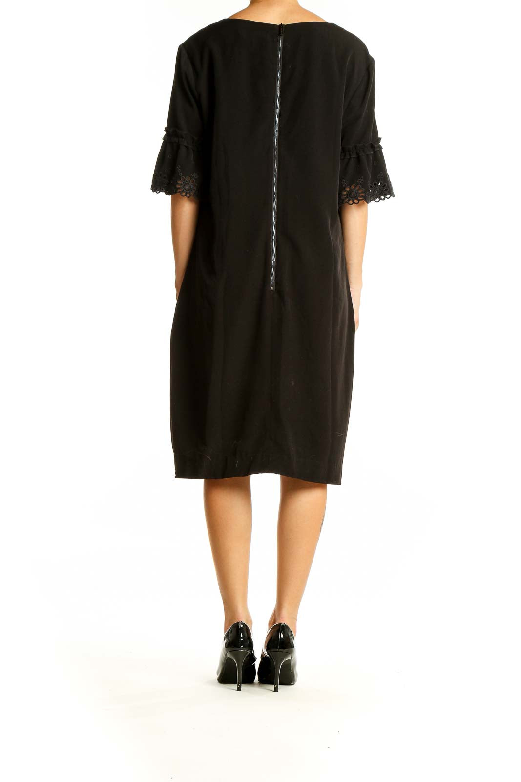 The dress boasts a relaxed fit through the body, making it flattering for all figures. Its knee-length design strikes the perfect balance between modesty and modern appeal. The round neckline and straight cut create a sleek, streamlined look that's perfect for both office wear and evening events.