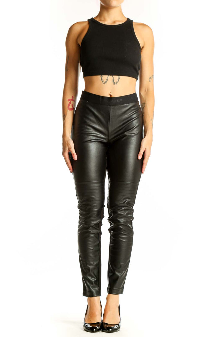Step into sleek sophistication with these black faux leather pants from Karl Lagerfeld. Crafted from a luxurious blend of nylon, polyester, polyurethane, rayon, and spandex, these pants offer both style and comfort. The slim-fit silhouette hugs your curves in all the right places, creating a flattering and modern look.