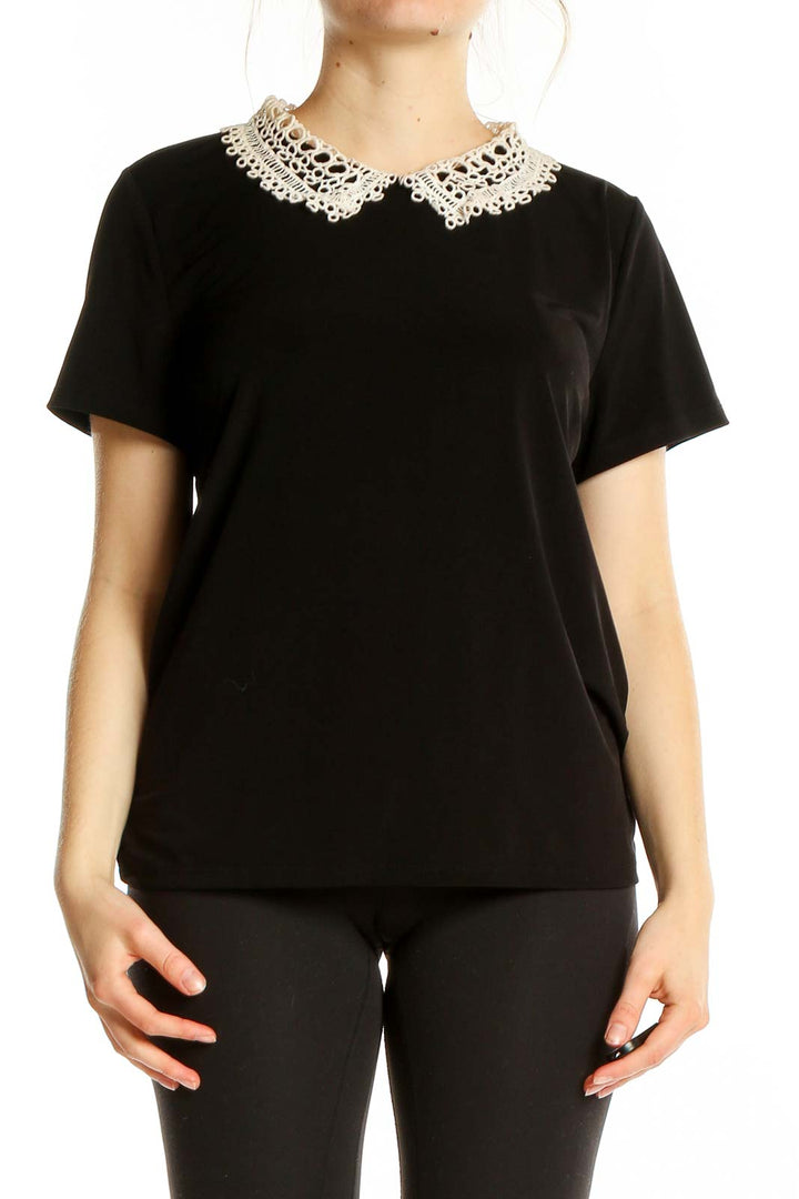 Elevate your wardrobe with this sophisticated black top from Karl Lagerfeld. The standout feature is its exquisite white lace collar, adding a touch of vintage charm to a modern silhouette. Crafted from a comfortable blend of polyester and spandex, this top offers both style and ease of movement.