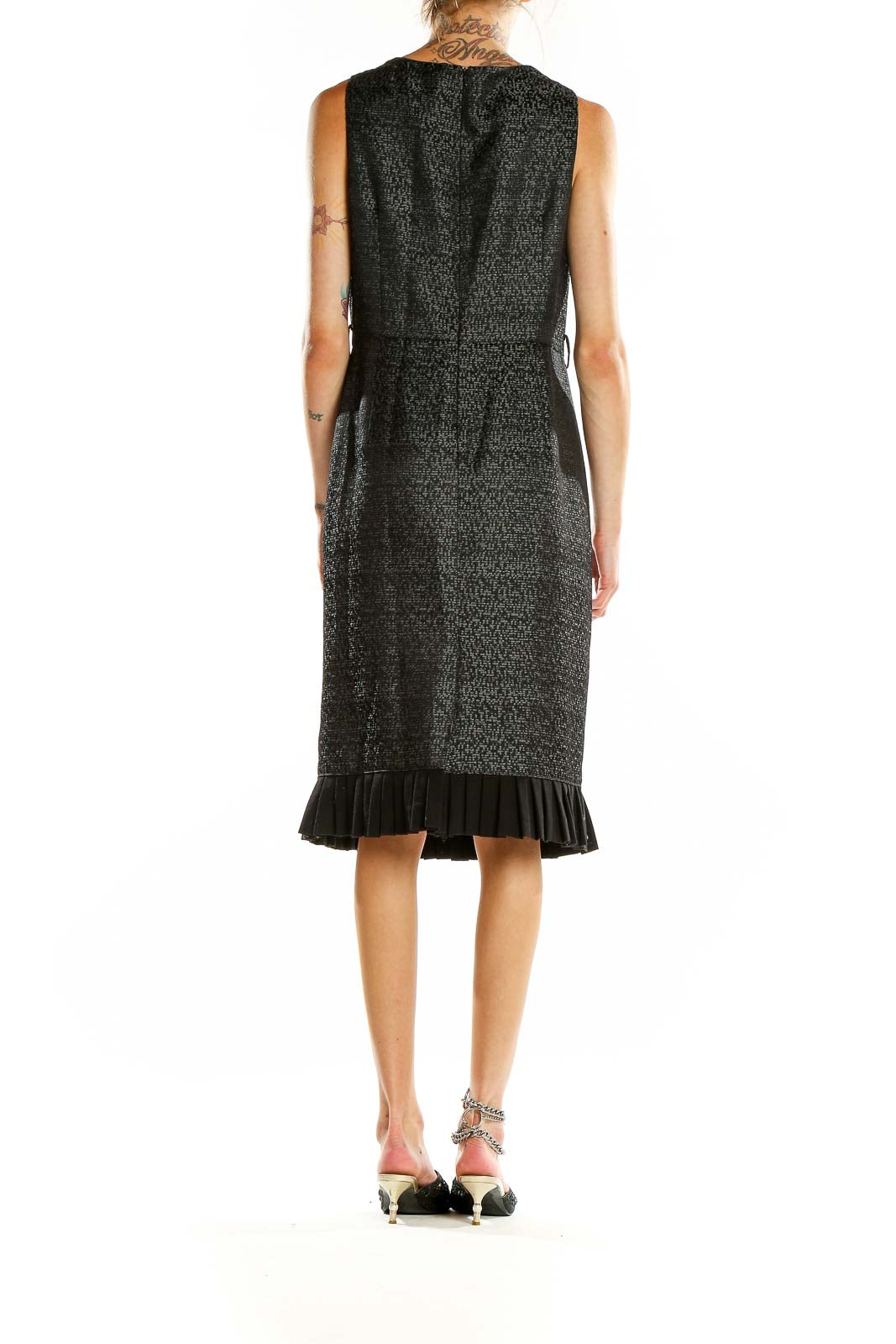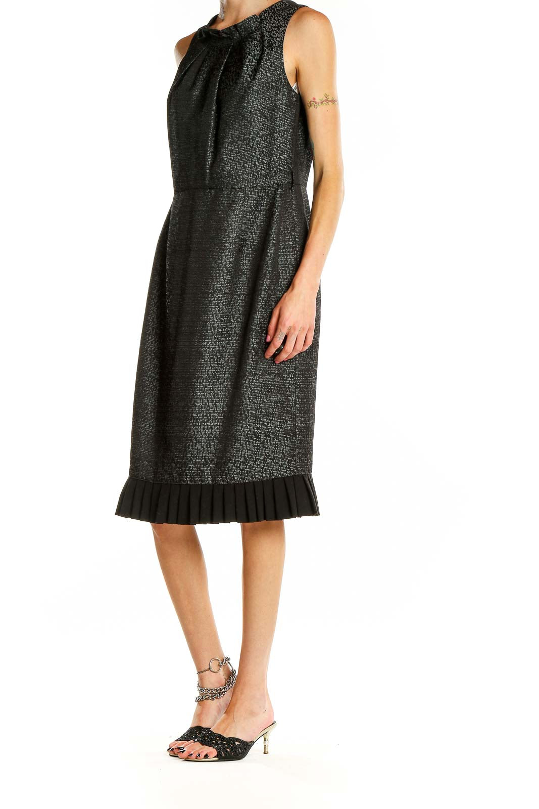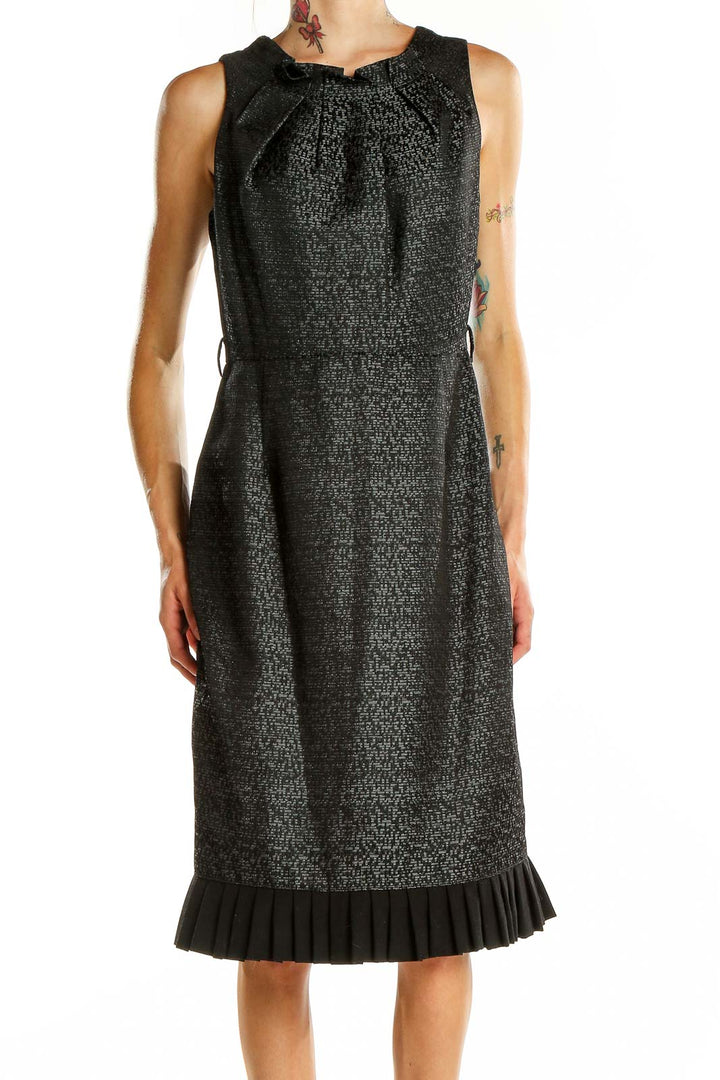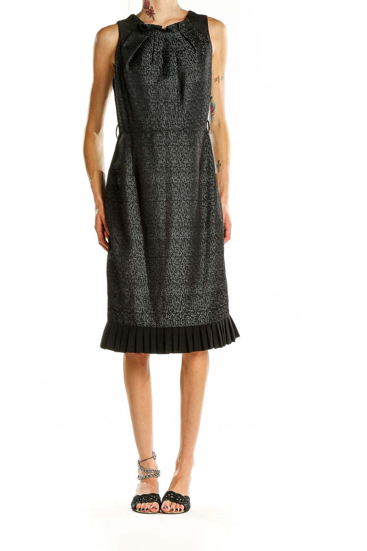 Elevate your wardrobe with this sophisticated black textured midi dress from Kasper. The sleeveless design features a flattering round neckline with subtle pleating, creating an elegant silhouette. Crafted from a luxurious blend of polyester and rayon, this dress offers both comfort and style. The textured fabric adds depth and interest to the overall look, making it perfect for both office wear and evening events. The dress is cinched at the waist for a feminine shape and falls to a midi length with a charming pleated hem detail. In excellent condition, this versatile piece is a must-have for any fashion-forward woman's closet.