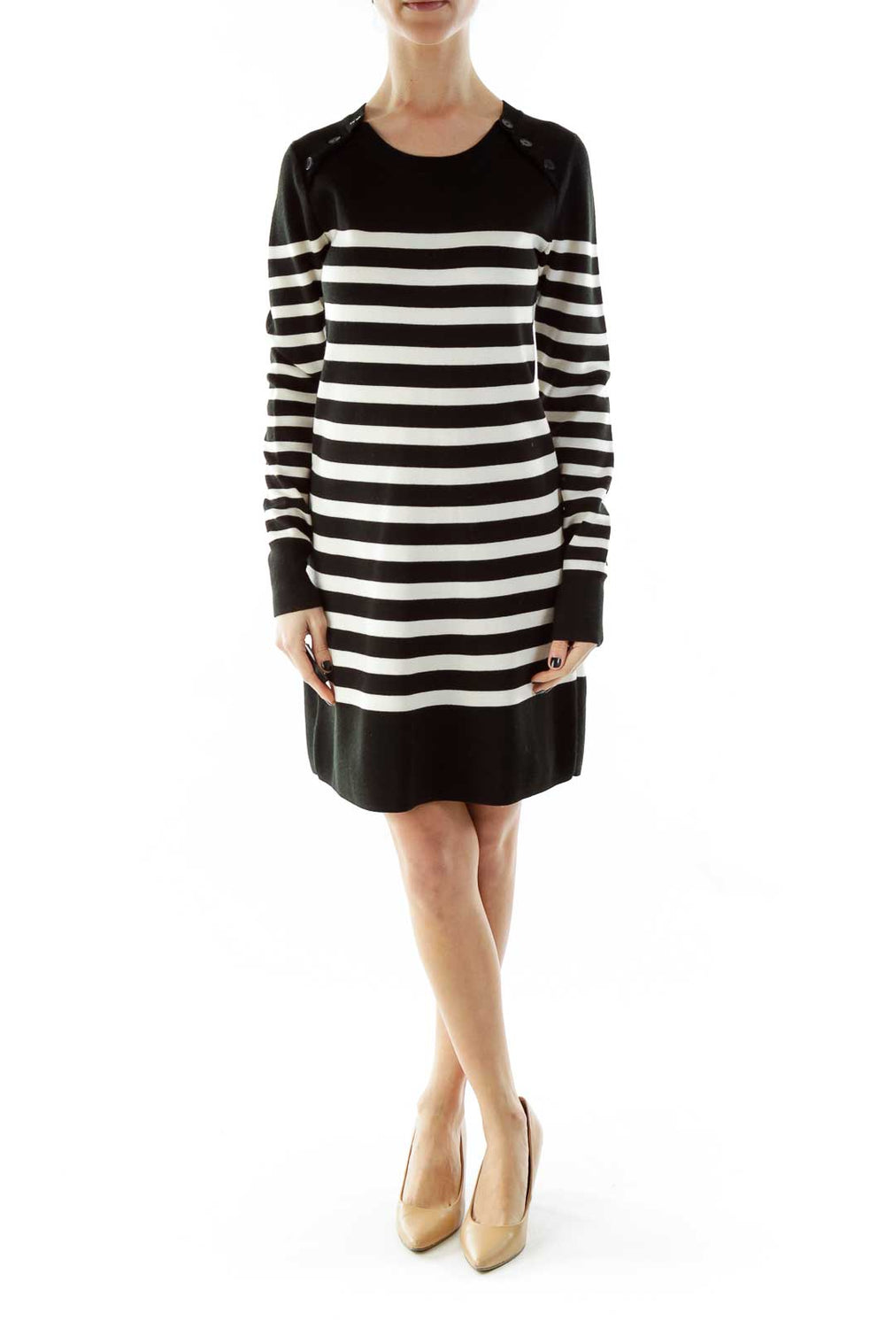 Black White Striped Buttoned Round Neck Knit Dress