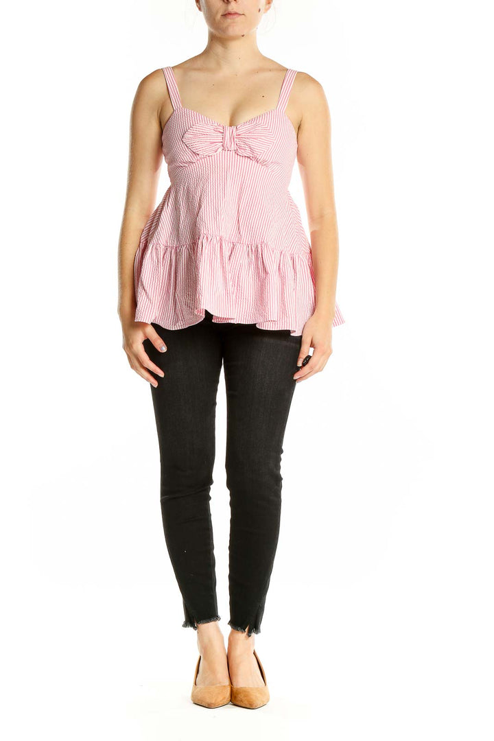Elevate your summer wardrobe with this charming pink and white striped peplum top from Kate Spade New York. The sweet bow detail at the sweetheart neckline adds a feminine touch, while the fitted bodice and flared peplum silhouette create a flattering shape. Crafted from a comfortable cotton-elastane blend, this top offers both style and ease of wear. The seersucker-like texture adds visual interest and a classic warm-weather feel. Perfect for casual outings or dressed up for special occasions, this versatile piece showcases Kate Spade's signature playful elegance. In good condition, this XS top features a smocked back panel for a customized fit and adjustable straps for added comfort. With its timeless design and quality construction, this top is a delightful addition to any fashion-forward wardrobe.