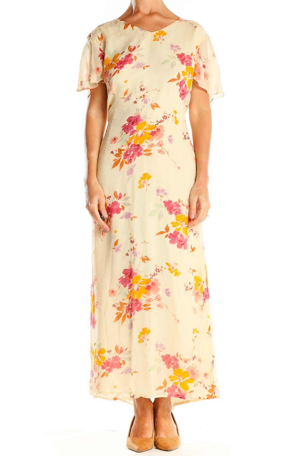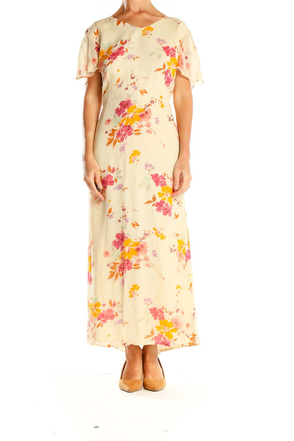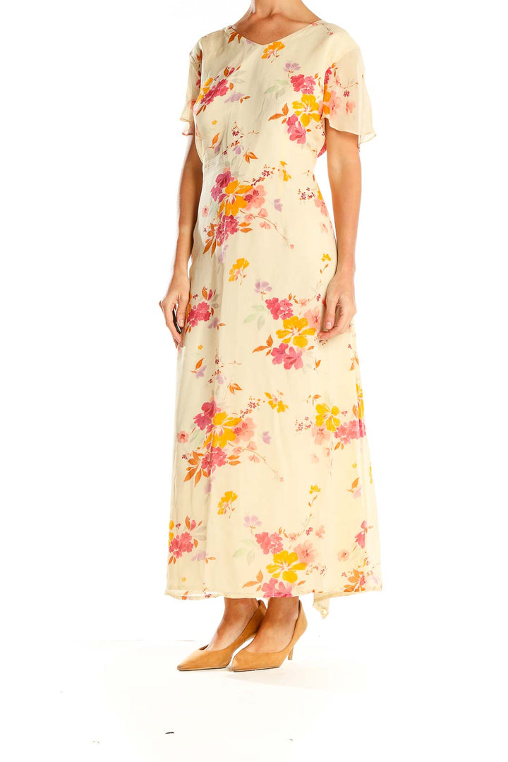 Beige Floral Print Silk Column Dress