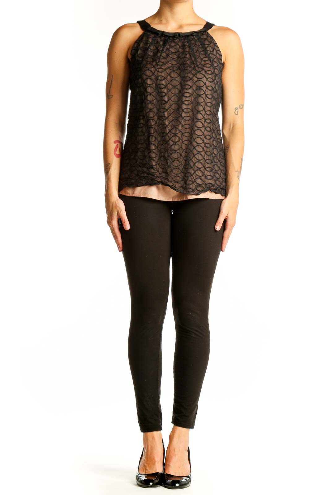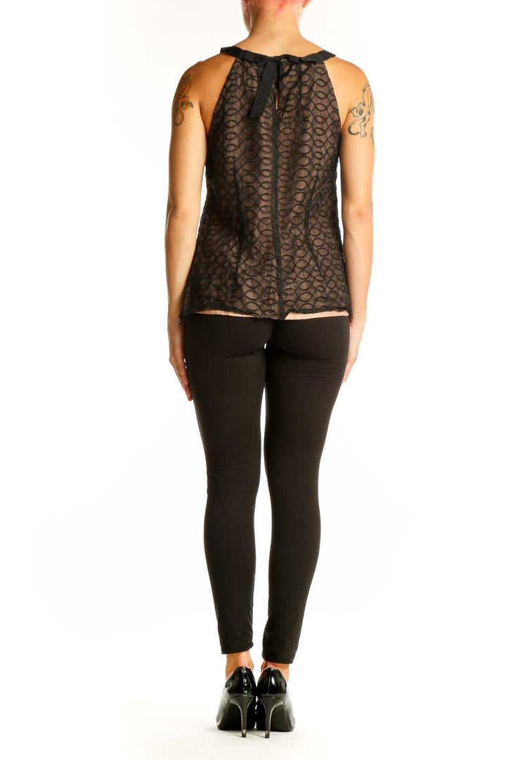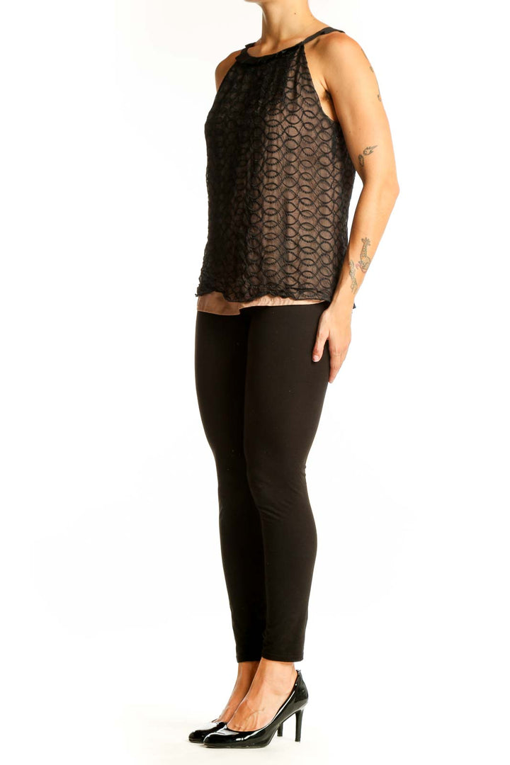 Elevate your wardrobe with this exquisite Black Lace Overlay Sleeveless Top by Kenar. This sophisticated piece features a delicate black lace pattern over a nude underlay, creating a stunning visual effect that's both elegant and alluring. The sleeveless design and high neckline offer a classic silhouette, perfect for both office wear and evening occasions.