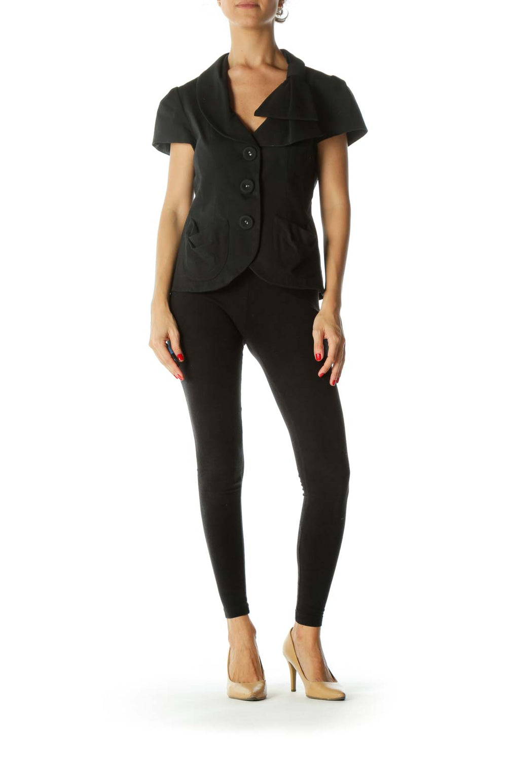 Black V-Neck Fabric-Buttons Bow-Shoulder Detail Textured Short-Sleeve Blazer