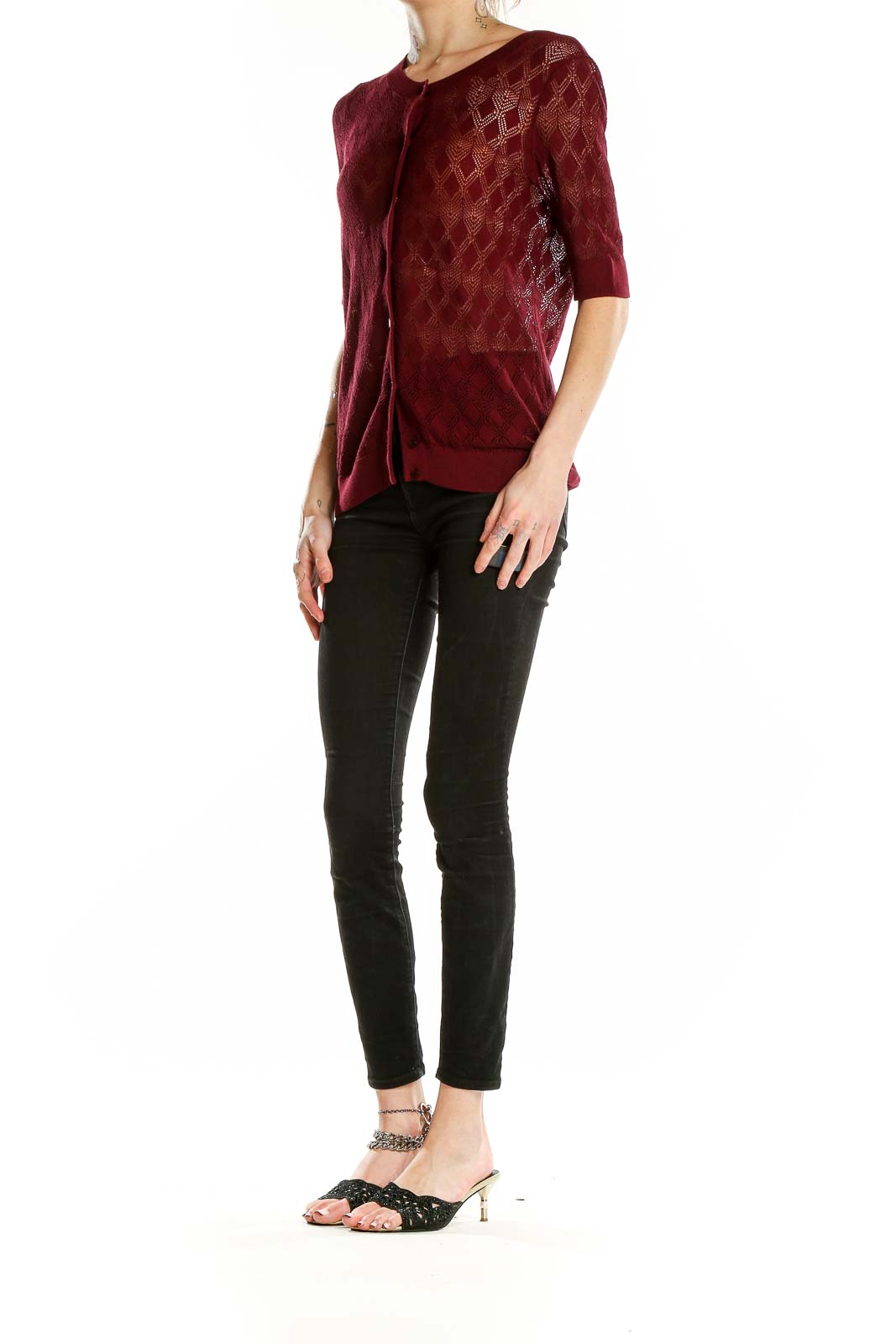 Designed with a classic button-front closure and elbow-length sleeves, this cardigan offers versatility for various occasions. Its rich burgundy hue adds a sophisticated touch to any outfit, making it perfect for both office wear and casual outings. The excellent condition of this garment speaks to its quality and durability.