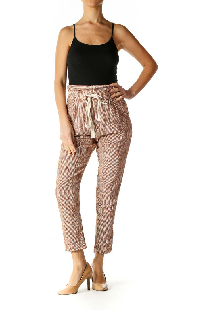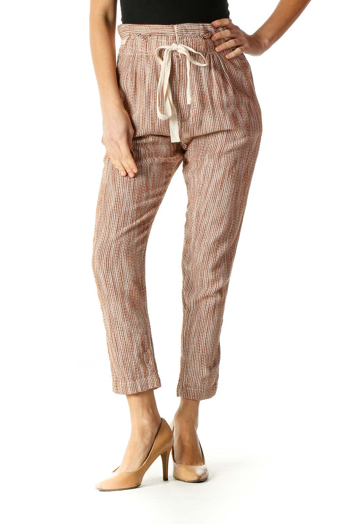 Step into effortless style with these beige striped drawstring pants from Free People. The vertical stripes create a slimming effect while adding a touch of bohemian flair. Made from a lightweight fabric, these pants feature a comfortable elastic waistband with an adjustable drawstring for a perfect fit. The relaxed silhouette and cropped length make them ideal for both casual outings and lounging at home. With side pockets and a tapered leg, these pants combine functionality with fashion. The excellent condition ensures you'll enjoy these versatile pants for seasons to come.