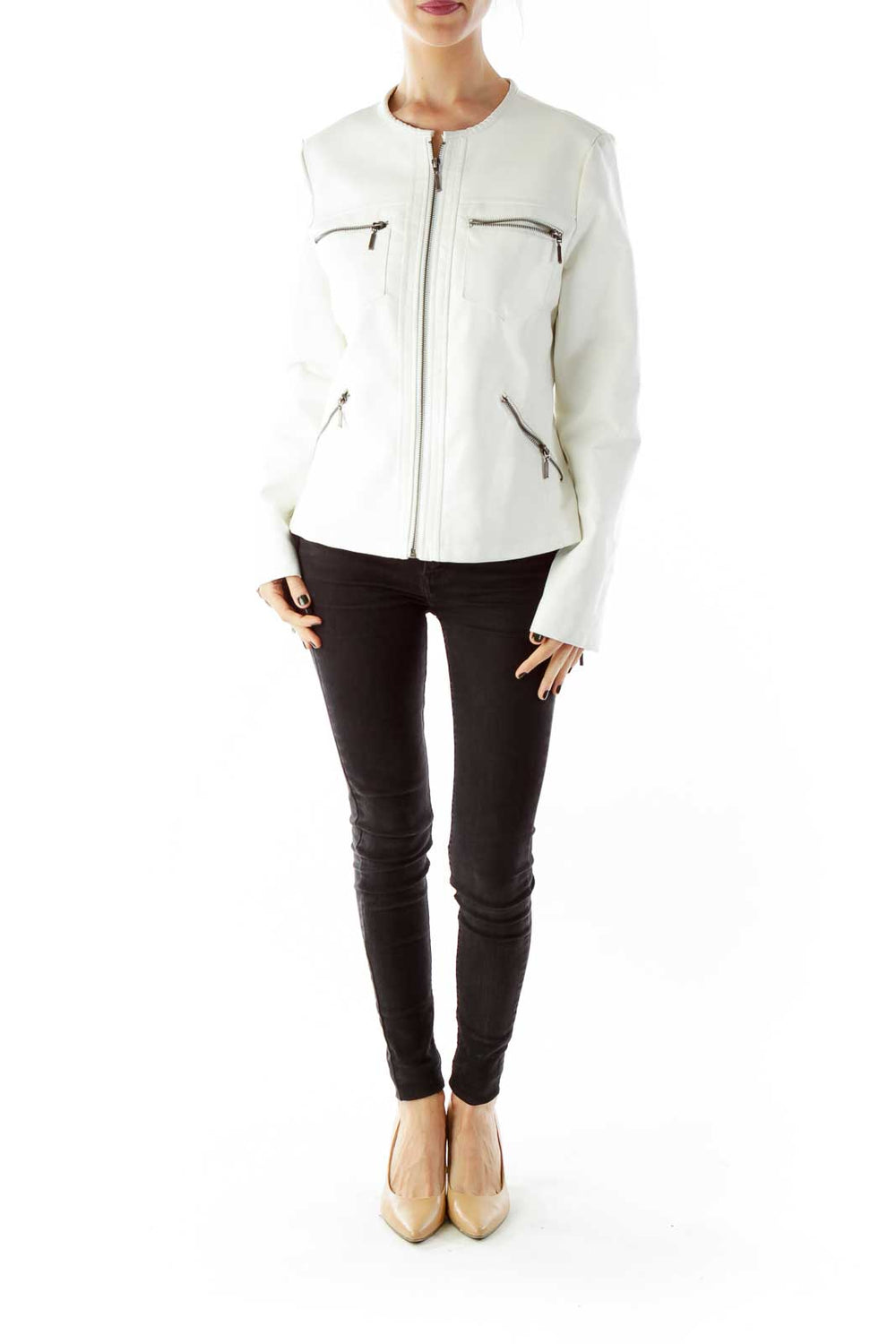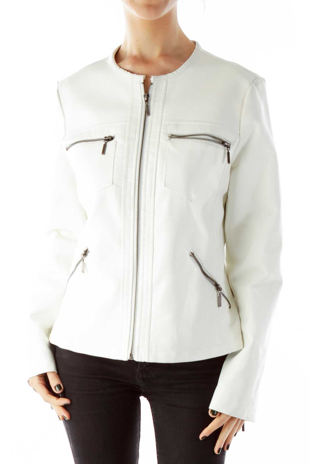 White Zippered Pocketed Faux-Leather Jacket