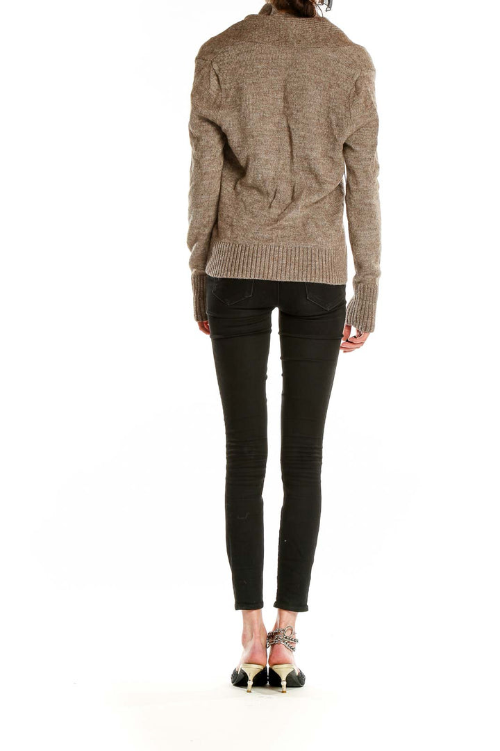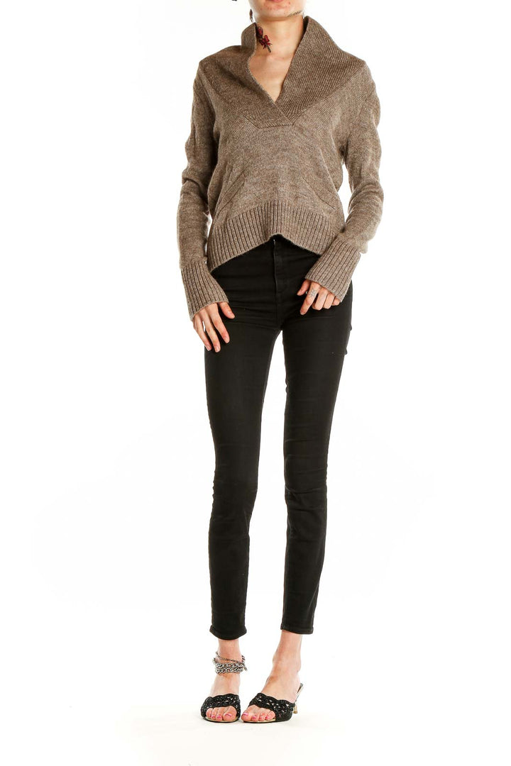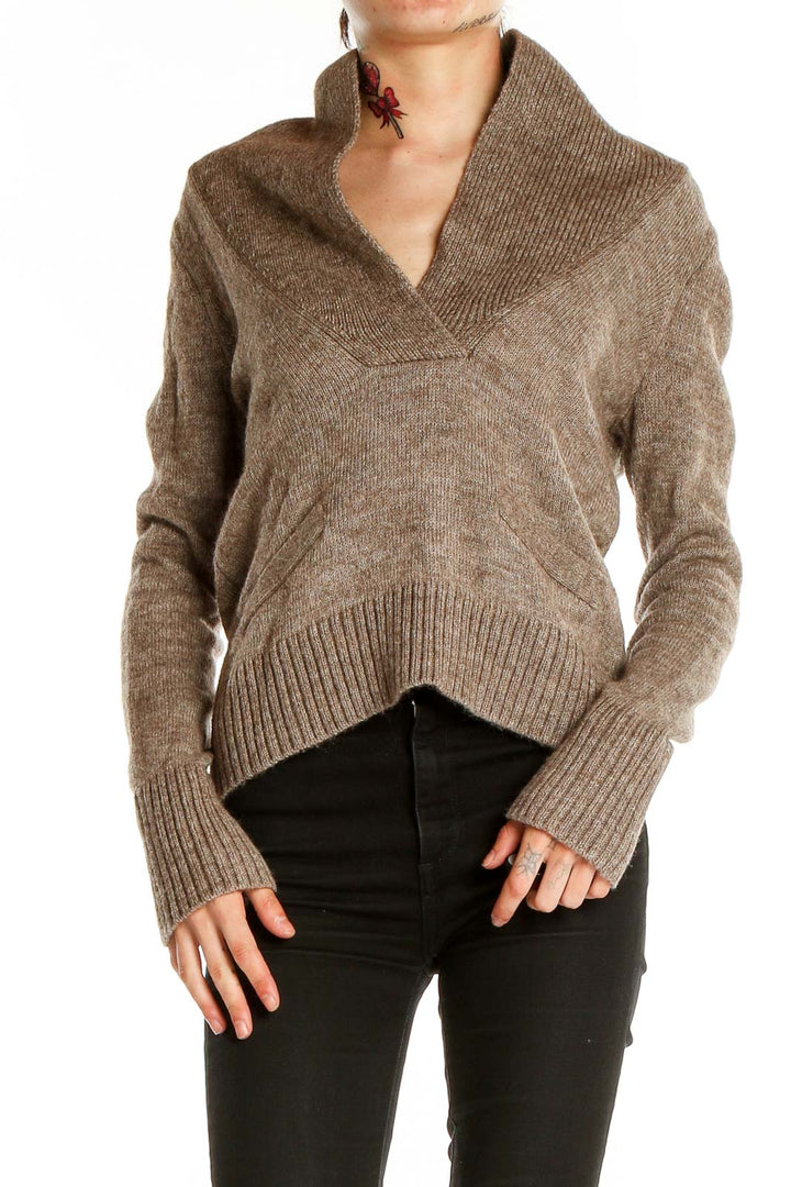 Elevate your casual wardrobe with this sophisticated brown V-neck sweater from J.Crew. Crafted from a soft, luxurious knit fabric, this piece offers both style and comfort. The ribbed texture adds a touch of elegance, while the V-neckline creates a flattering silhouette. With its versatile design, this sweater can be easily dressed up or down for various occasions.