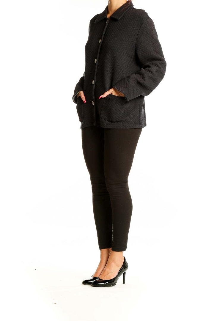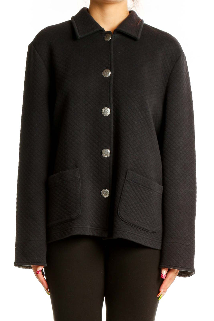 Elevate your outerwear collection with this sophisticated black quilted jacket by Koret. Crafted from a comfortable blend of cotton and polyester, this versatile piece offers both style and functionality. The classic button-up front features distinctive silver-toned buttons, adding a touch of elegance to the overall design.