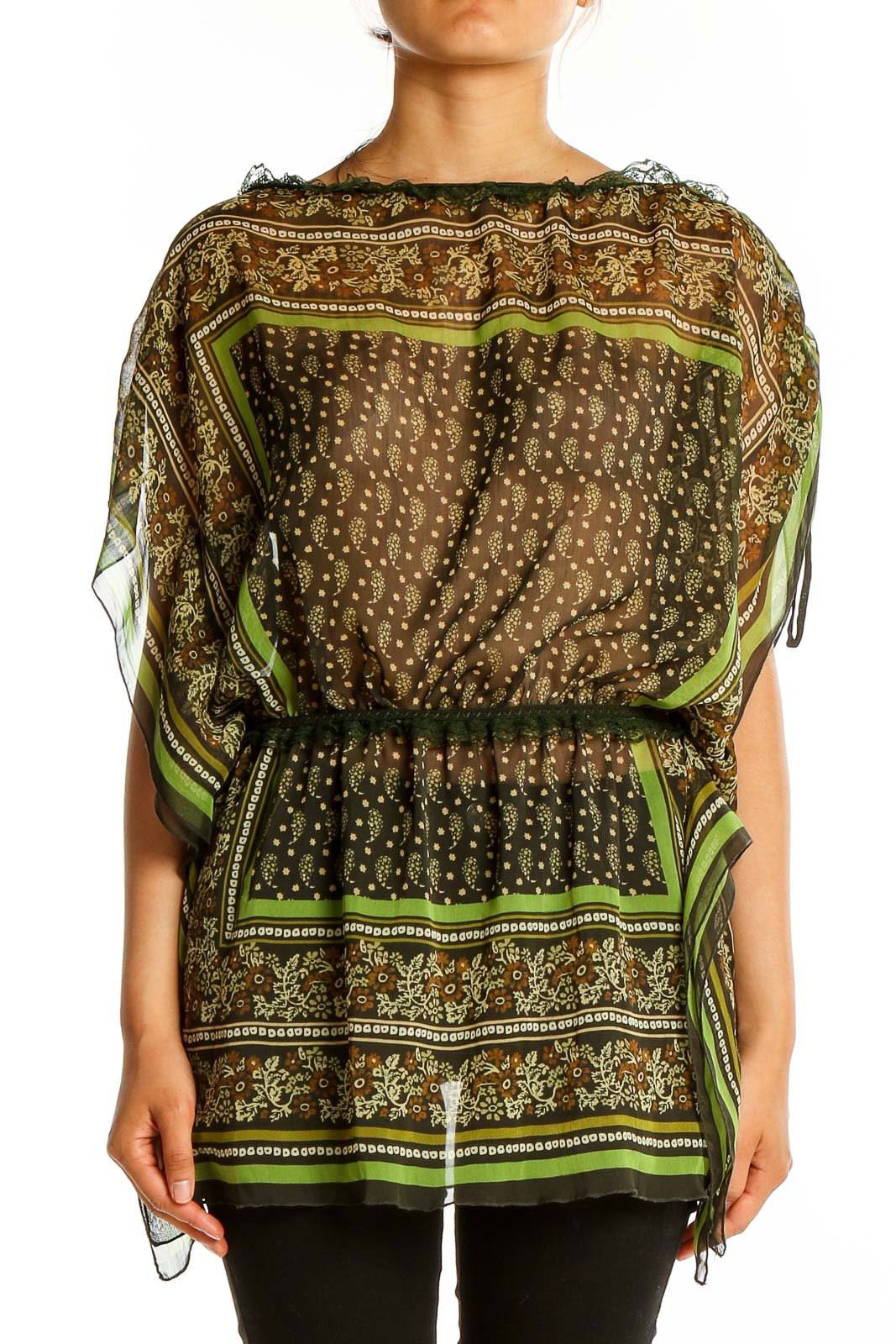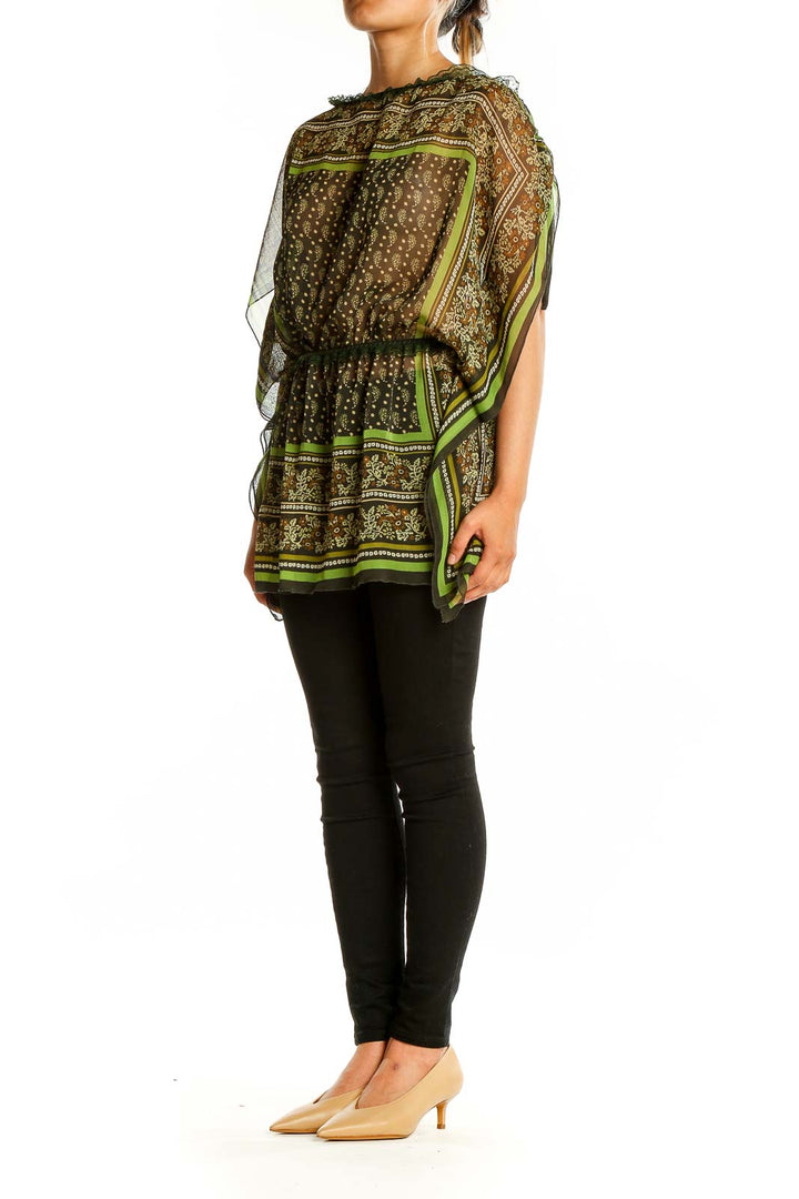 Elevate your style with this enchanting green patterned sheer tunic top by V Cristina. This exquisite piece features an intricate design of floral and geometric patterns in shades of olive green, brown, and beige, creating a mesmerizing visual effect. The lightweight polyester fabric drapes beautifully, offering a flattering and comfortable fit for various body types.