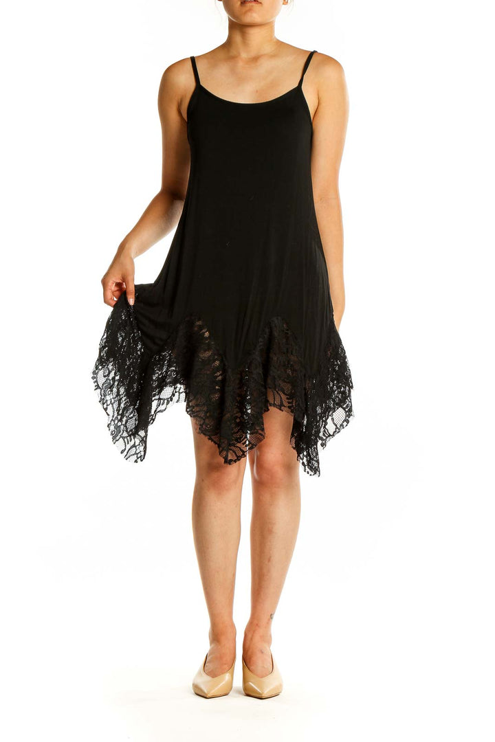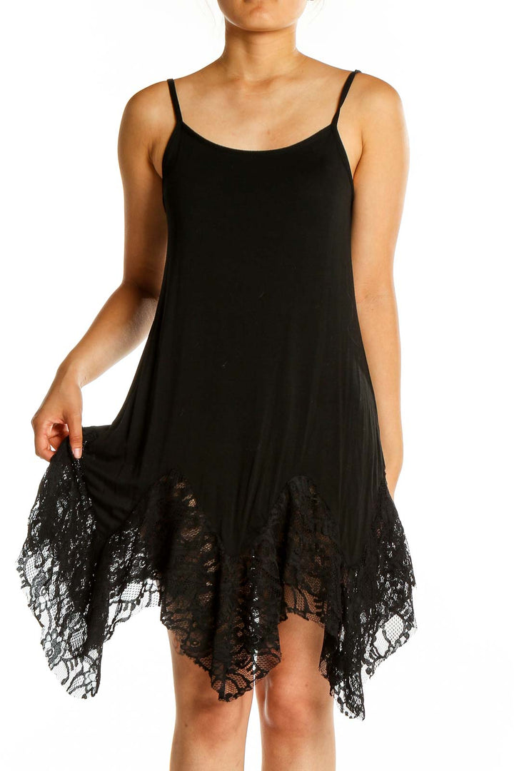 Elevate your wardrobe with this enchanting black slip dress by Oddy. Crafted from a luxurious blend of cotton, nylon, rayon, and spandex, this dress offers both comfort and style. The sleek silhouette is beautifully enhanced by delicate lace trim at the hem, creating an asymmetrical, handkerchief-style finish that adds a touch of romance and whimsy. Perfect for a night out or a special occasion, this dress features adjustable spaghetti straps for a customizable fit. The excellent condition of this size Small garment ensures you'll look and feel your best. With its versatile design and flattering cut, this Oddy dress is sure to become a favorite in your collection.