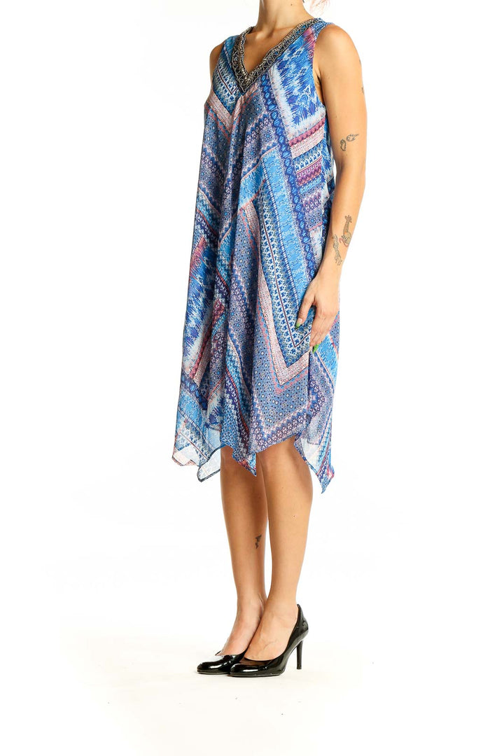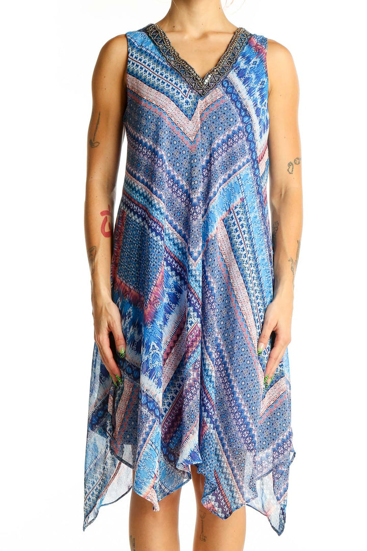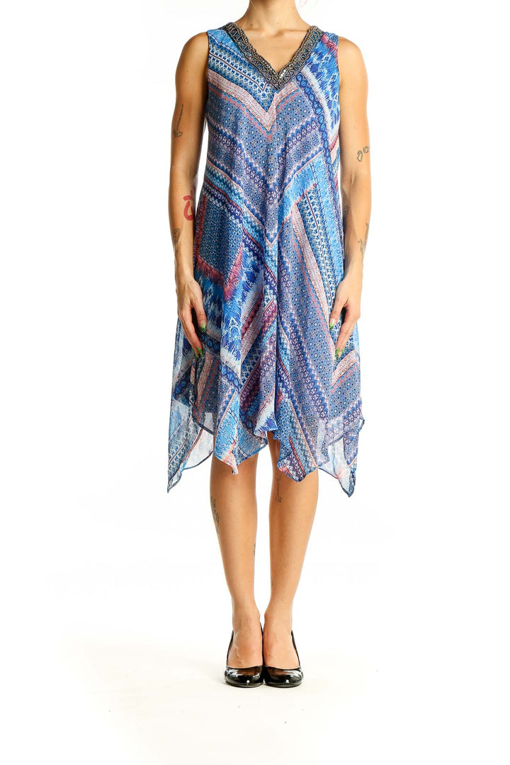 Step into a world of vibrant style with this stunning sleeveless dress by SANDRA DARREN. The eye-catching blue multicolor pattern features an intricate mix of geometric and floral designs, creating a mesmerizing visual effect that's sure to turn heads. The V-neckline is adorned with elegant beading, adding a touch of sparkle to your ensemble.