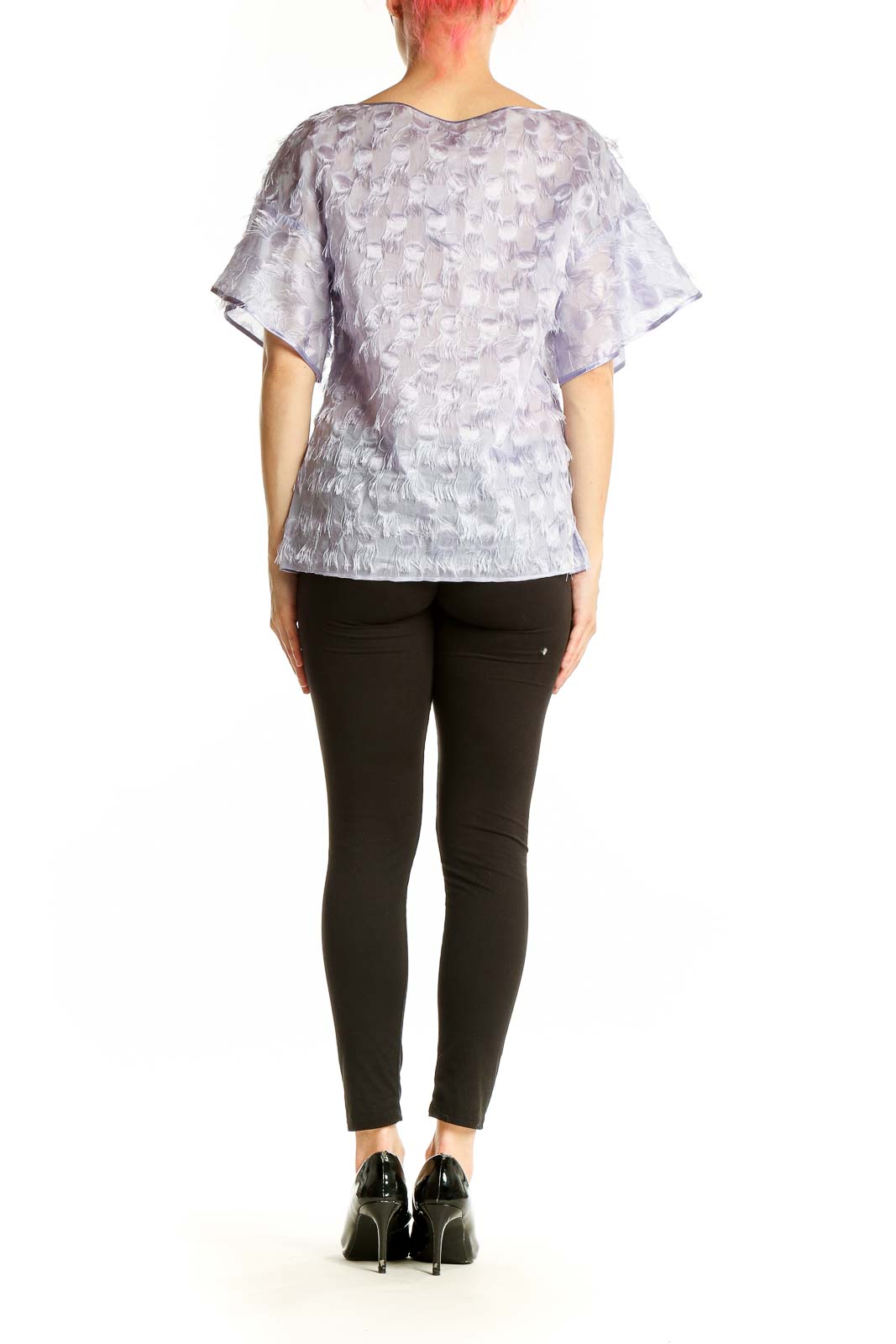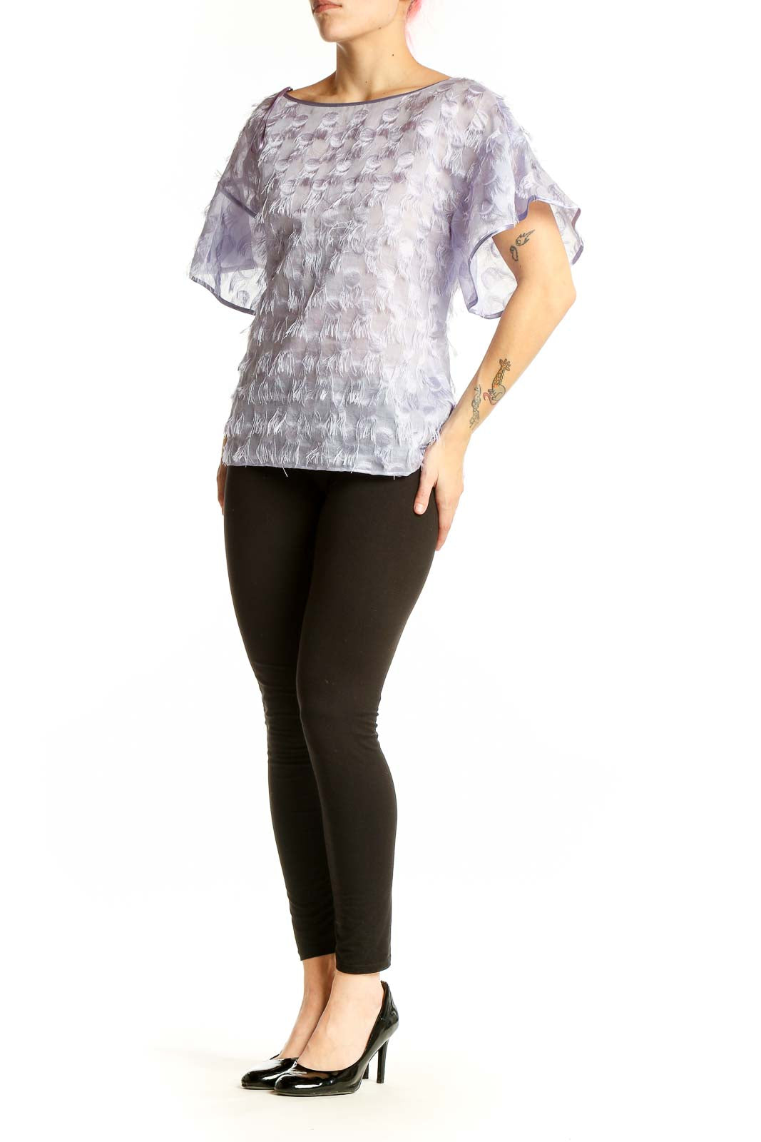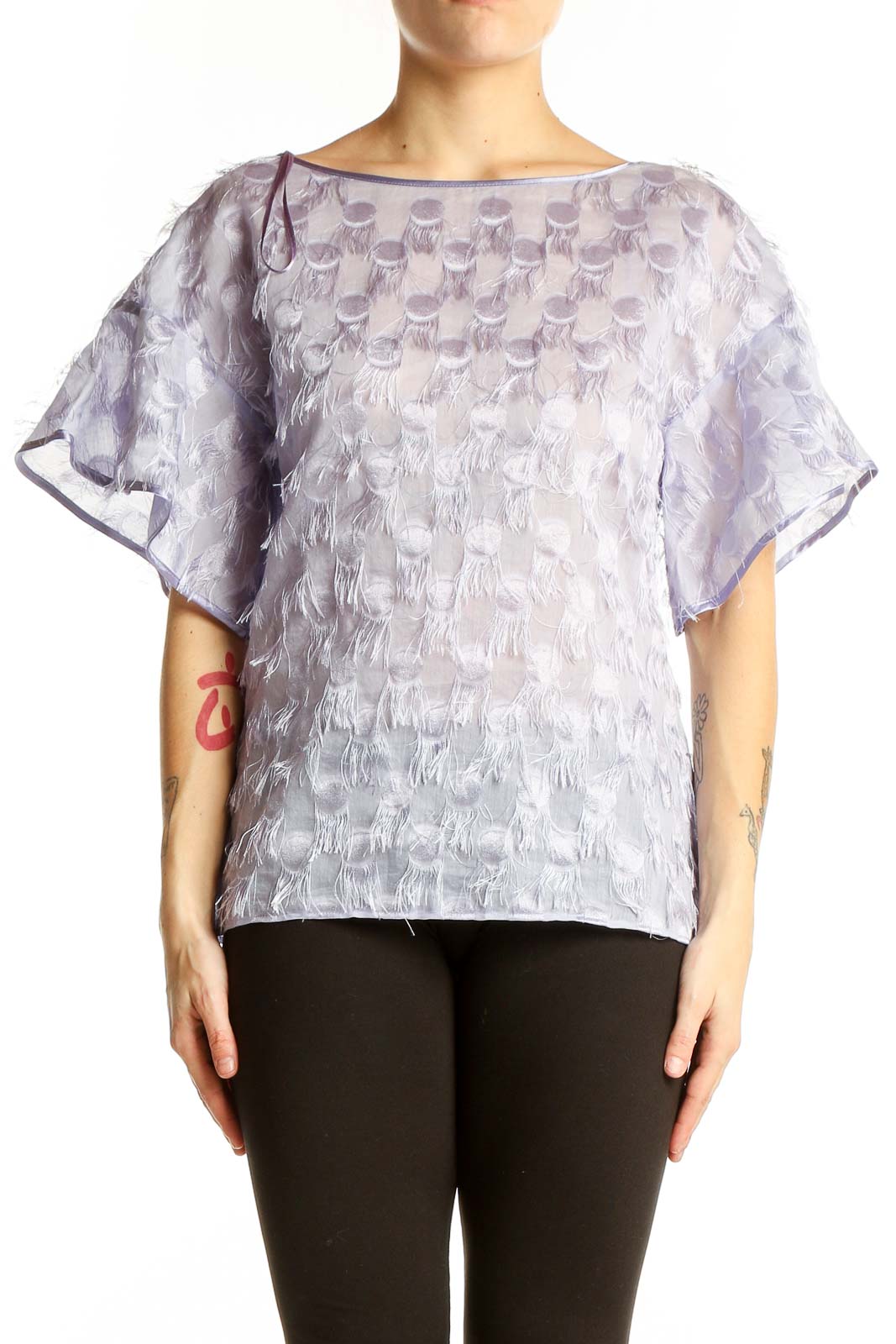 Elevate your wardrobe with this ethereal lavender blouse from Banana Republic. Crafted from a delicate blend of cotton and polyester, this top features an alluring sheer texture with a captivating all-over pattern that adds depth and intrigue to your look. The relaxed silhouette is accentuated by fluttery short sleeves, creating a soft and feminine aesthetic perfect for both casual and dressy occasions. With its boat neckline and comfortable fit, this blouse offers versatility and style in equal measure. The subtle lavender hue transitions beautifully from day to night, making it a must-have addition to your wardrobe. New with tags, this XS-sized top promises a fresh and flawless appearance right out of the box.