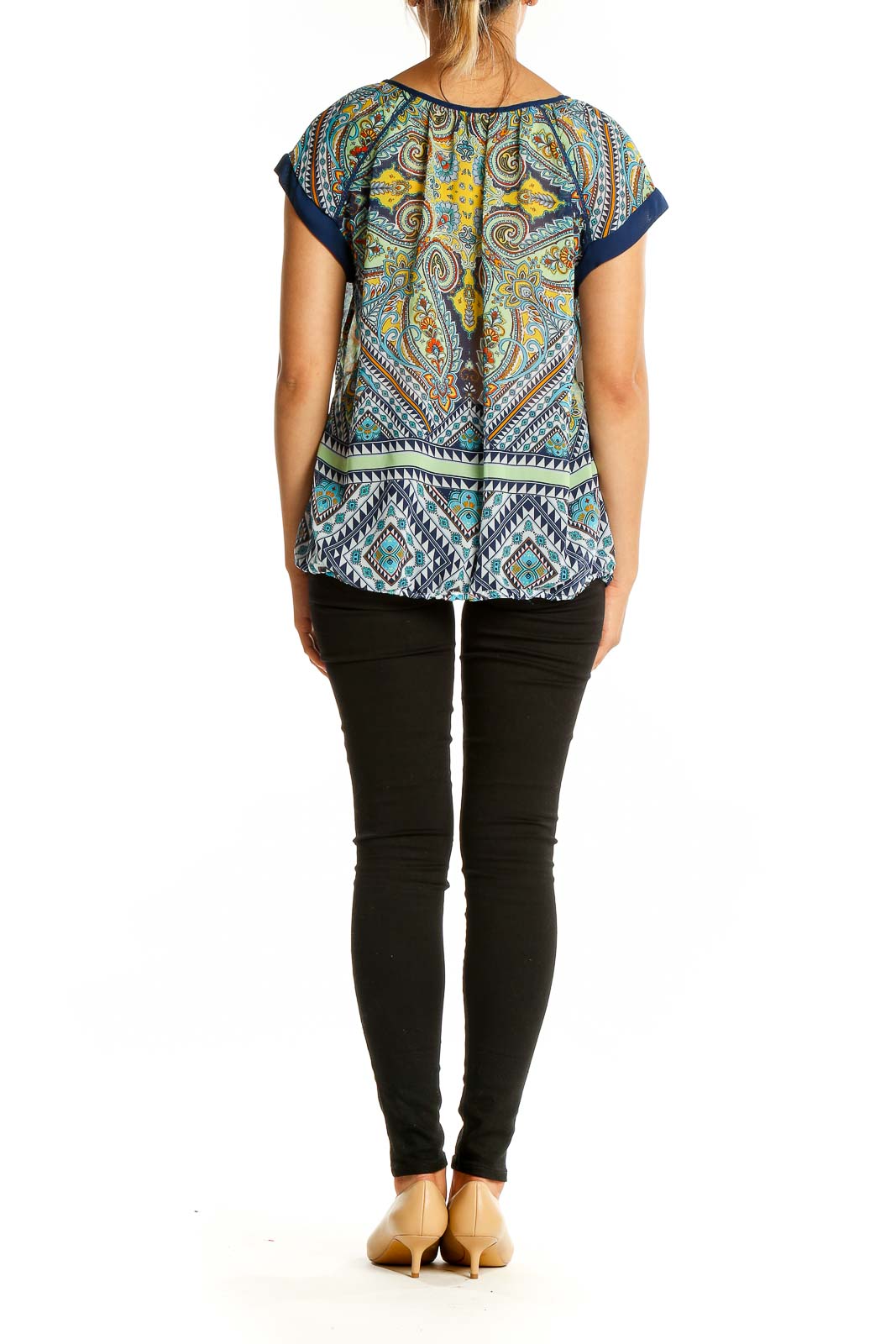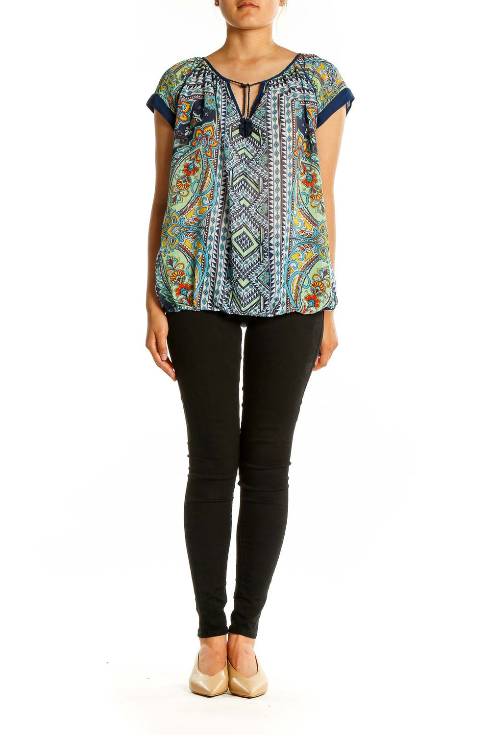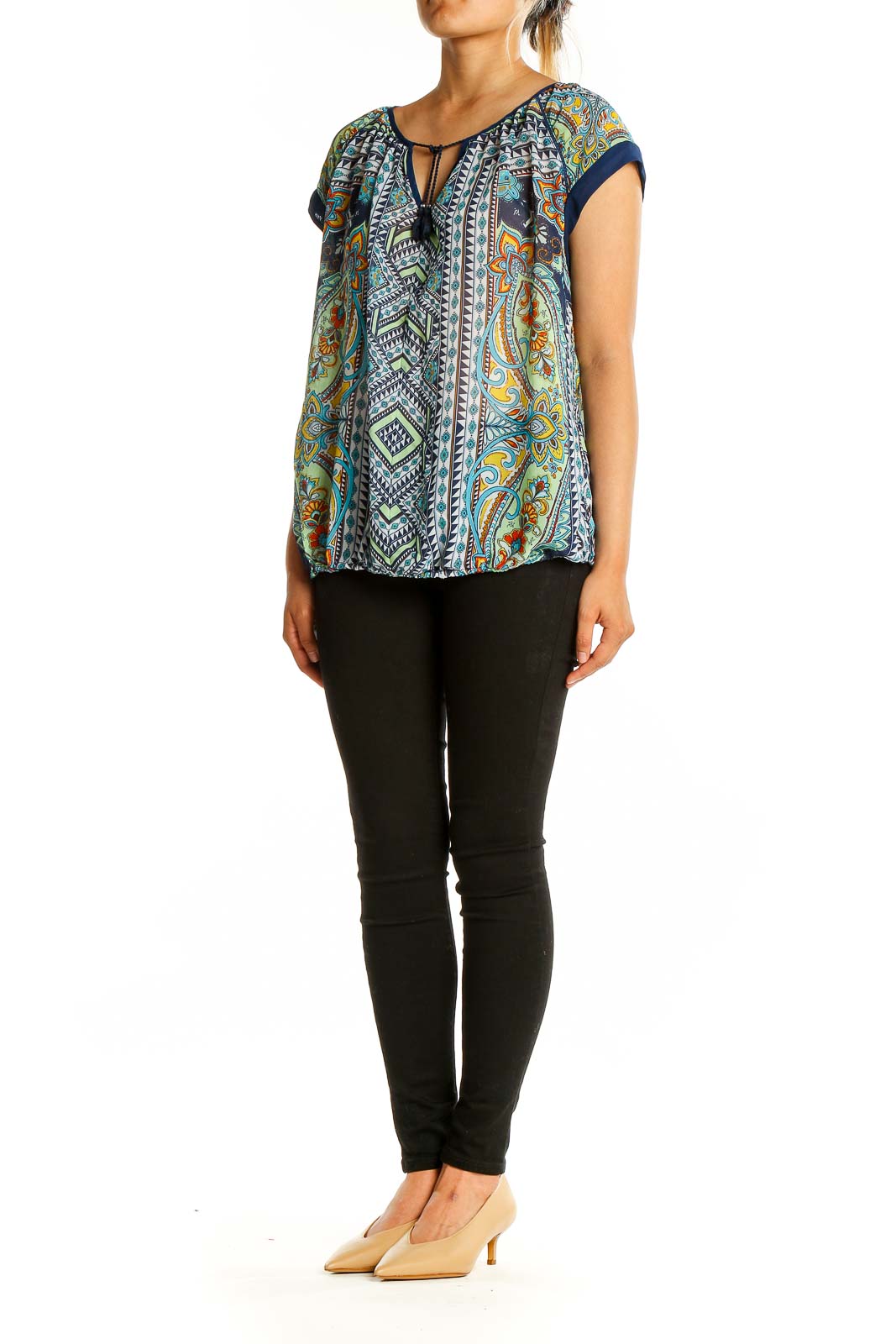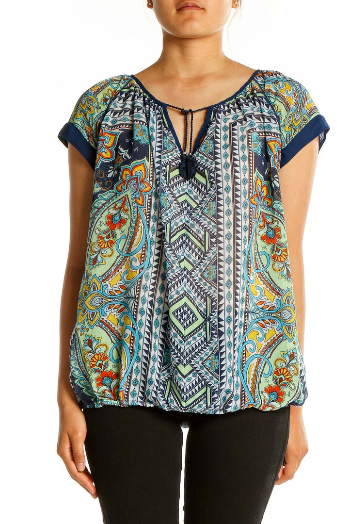 Elevate your casual wardrobe with this stunning Blue Multicolor Paisley Print Peasant Top from New Directions. This eye-catching piece features a vibrant mix of blue, green, yellow, and orange hues in an intricate paisley and geometric pattern that's sure to turn heads. The relaxed peasant-style silhouette offers both comfort and style, with a flattering scoop neckline adorned with a tassel-tied keyhole detail.