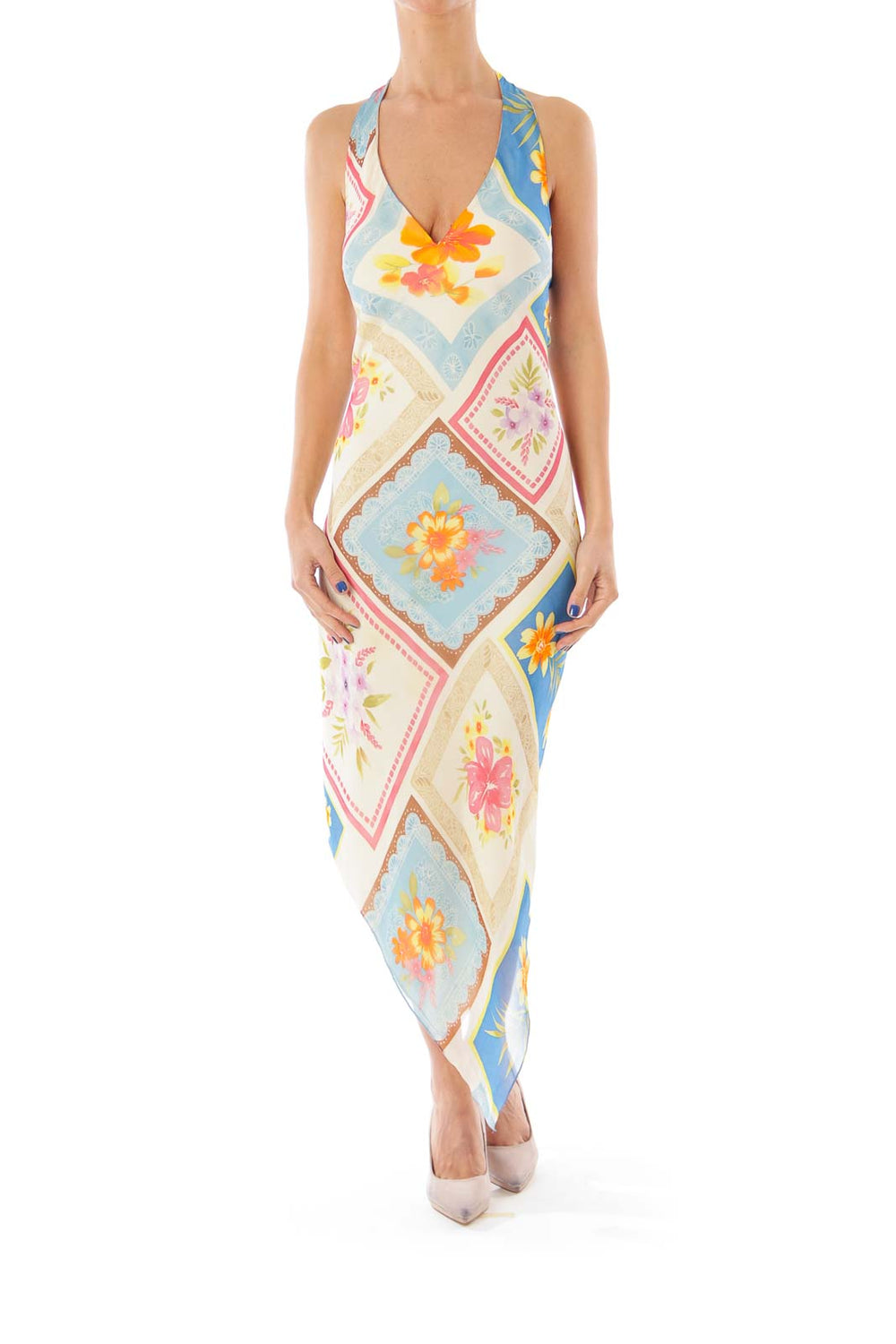 Beige Flower Print Halter Dress