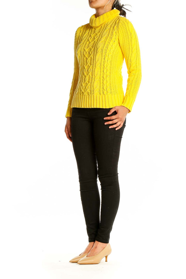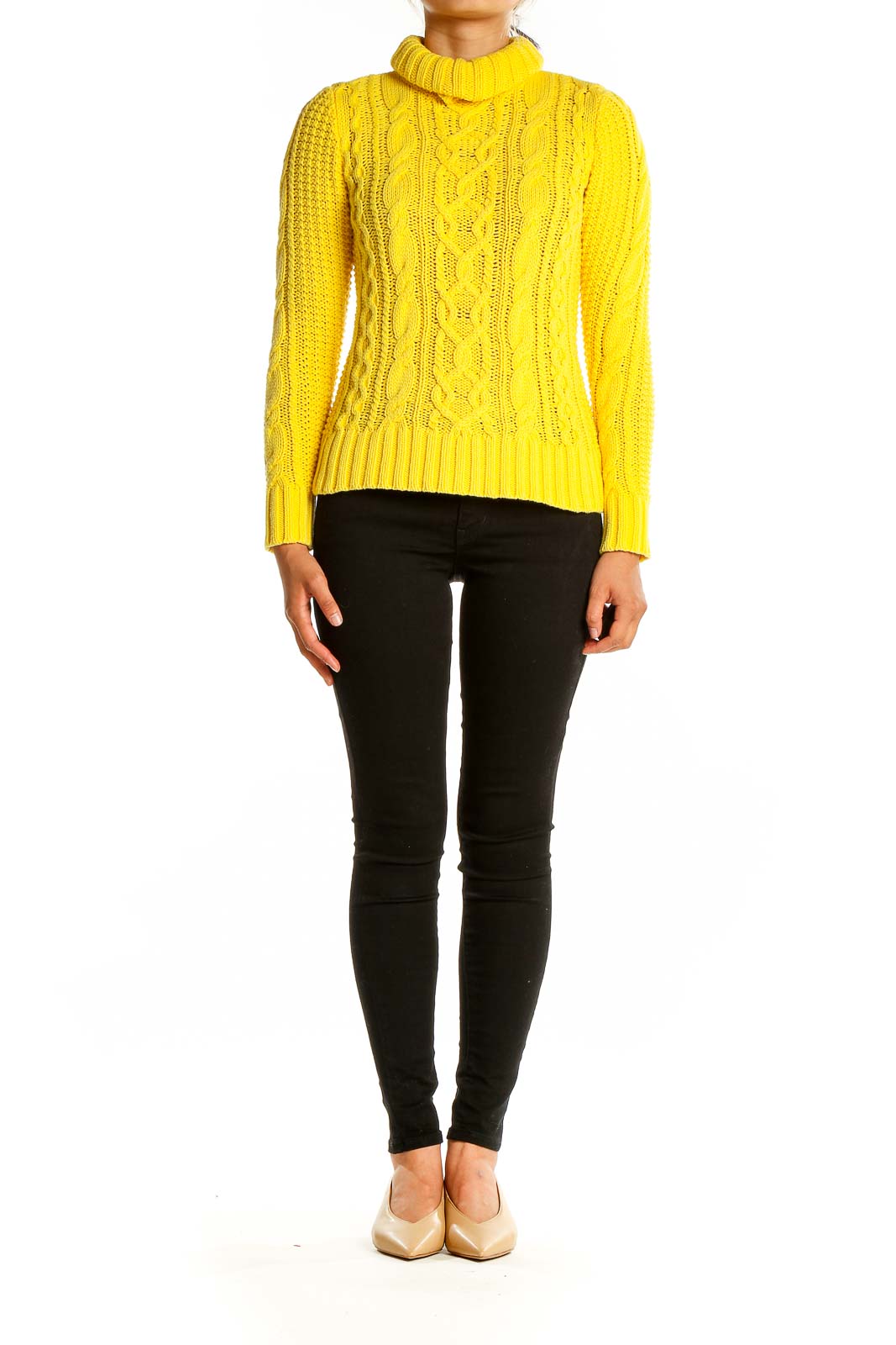 Front view of yellow cable knit turtleneck sweater by Lauren Jeans Co. Ralph Lauren