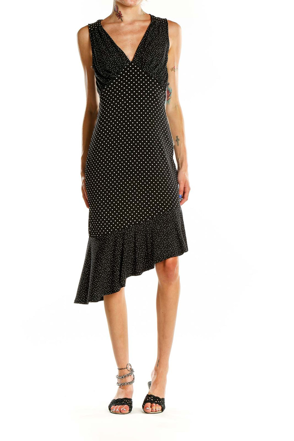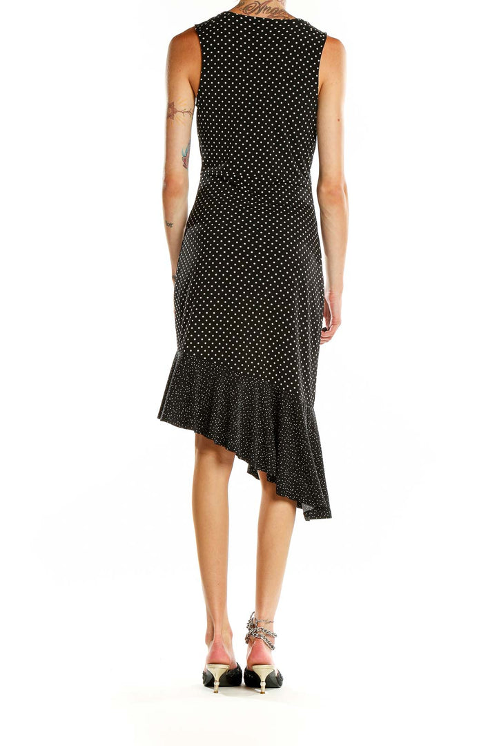 Make a statement with this chic black polka dot dress from Leota. The sleeveless design features a flattering V-neckline and wrap-style bodice that accentuates your curves. The asymmetric hemline adds a modern twist, with a flirty ruffle detail that cascades down one side. Made from a comfortable blend of cotton, polyester, rayon, and spandex, this dress offers both style and ease of wear. The fitted silhouette and midi length make it versatile enough for both office and evening occasions. In excellent condition, this size small dress is a must-have addition to your wardrobe.
