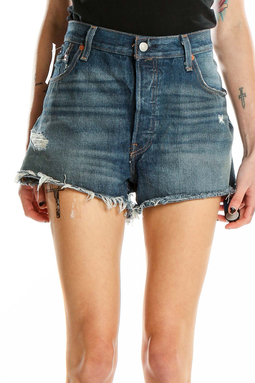 Step into summer with these classic blue denim cutoff shorts from Levi's. Featuring a distressed finish and raw hem, these shorts offer a perfectly worn-in look that's both stylish and comfortable. The medium-wash denim provides a versatile backdrop for any casual outfit, while subtle fading and whiskering add character and depth.