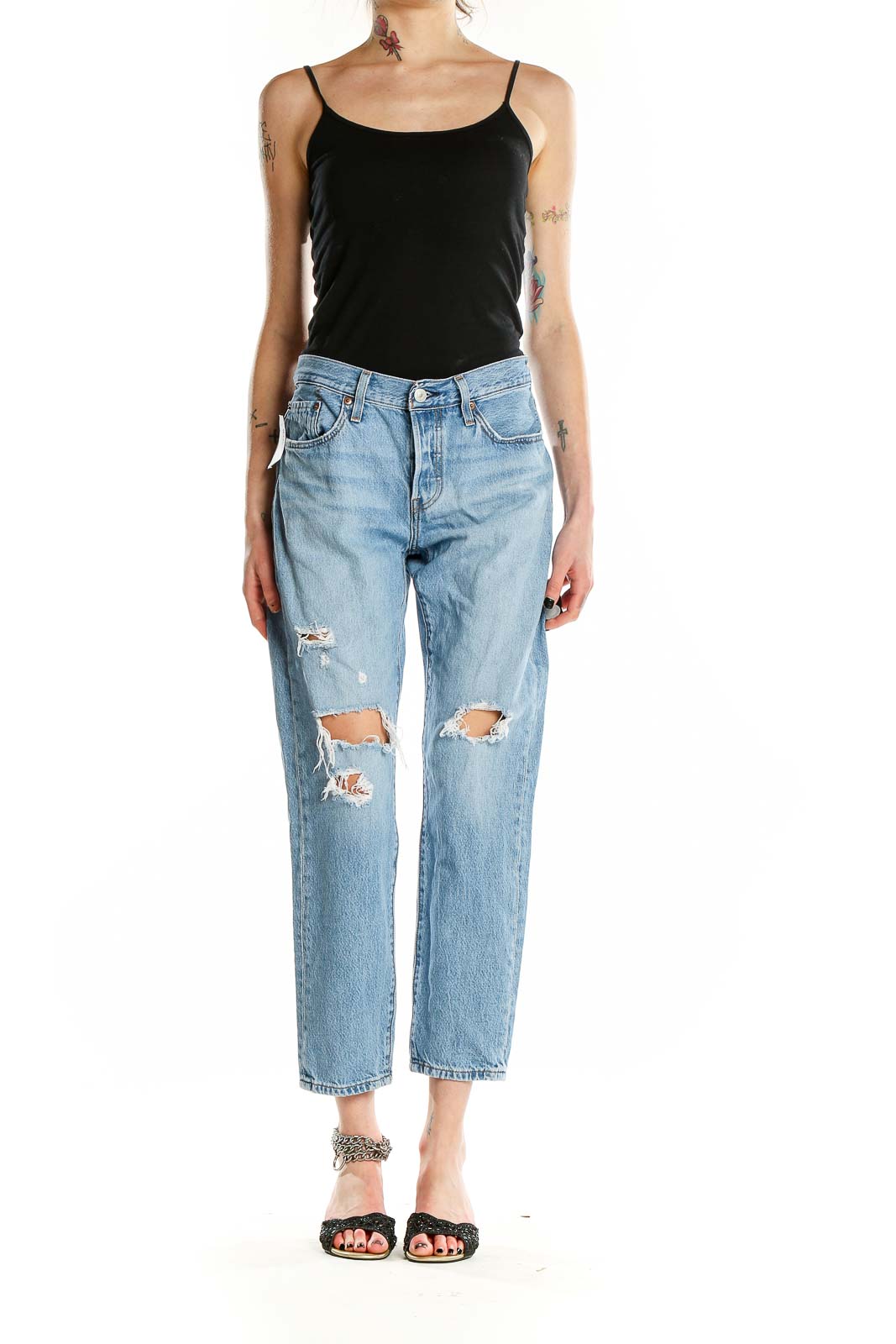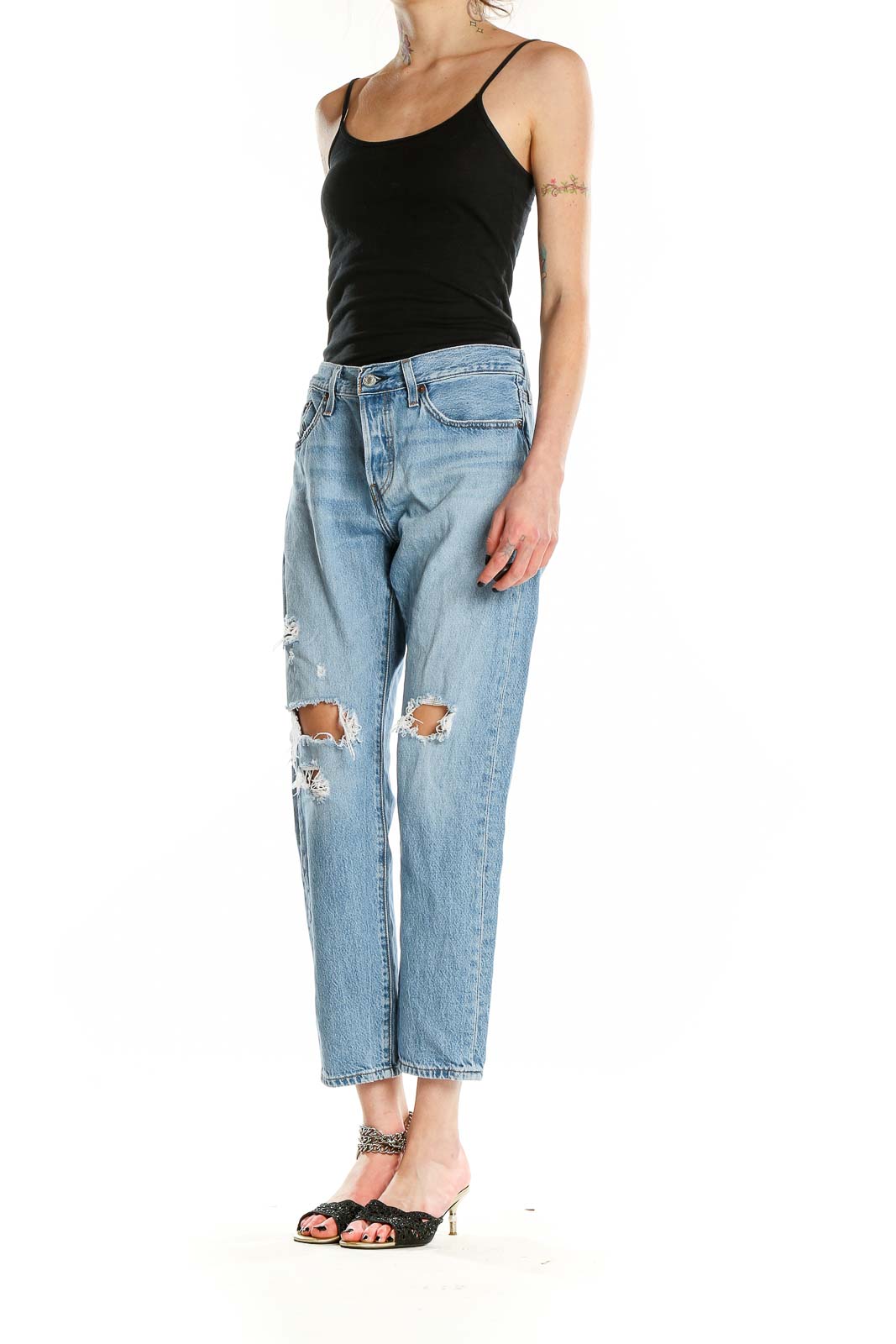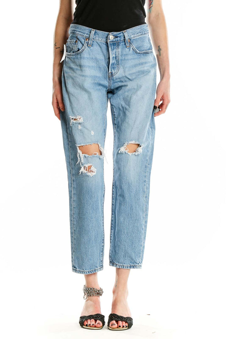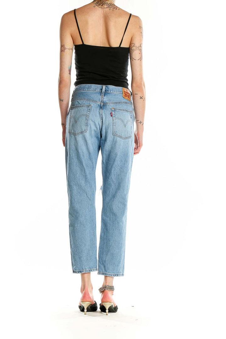 Step into effortless style with these light blue straight leg jeans from Levi's. Crafted from a comfortable blend of Algadon and cotton, these jeans offer both durability and breathability. The distressed detailing, including strategically placed rips on the knees, adds a touch of edgy charm to this classic denim piece. With a medium rise and straight leg cut, these jeans provide a flattering silhouette that's perfect for casual outings or dressed-up occasions. The good condition of these jeans ensures you'll enjoy their timeless appeal for years to come. Pair them with your favorite tee for a laid-back look or dress them up with a blouse for a more polished ensemble. The versatile medium wash complements a variety of tops and accessories, making these Levi's jeans a wardrobe essential.