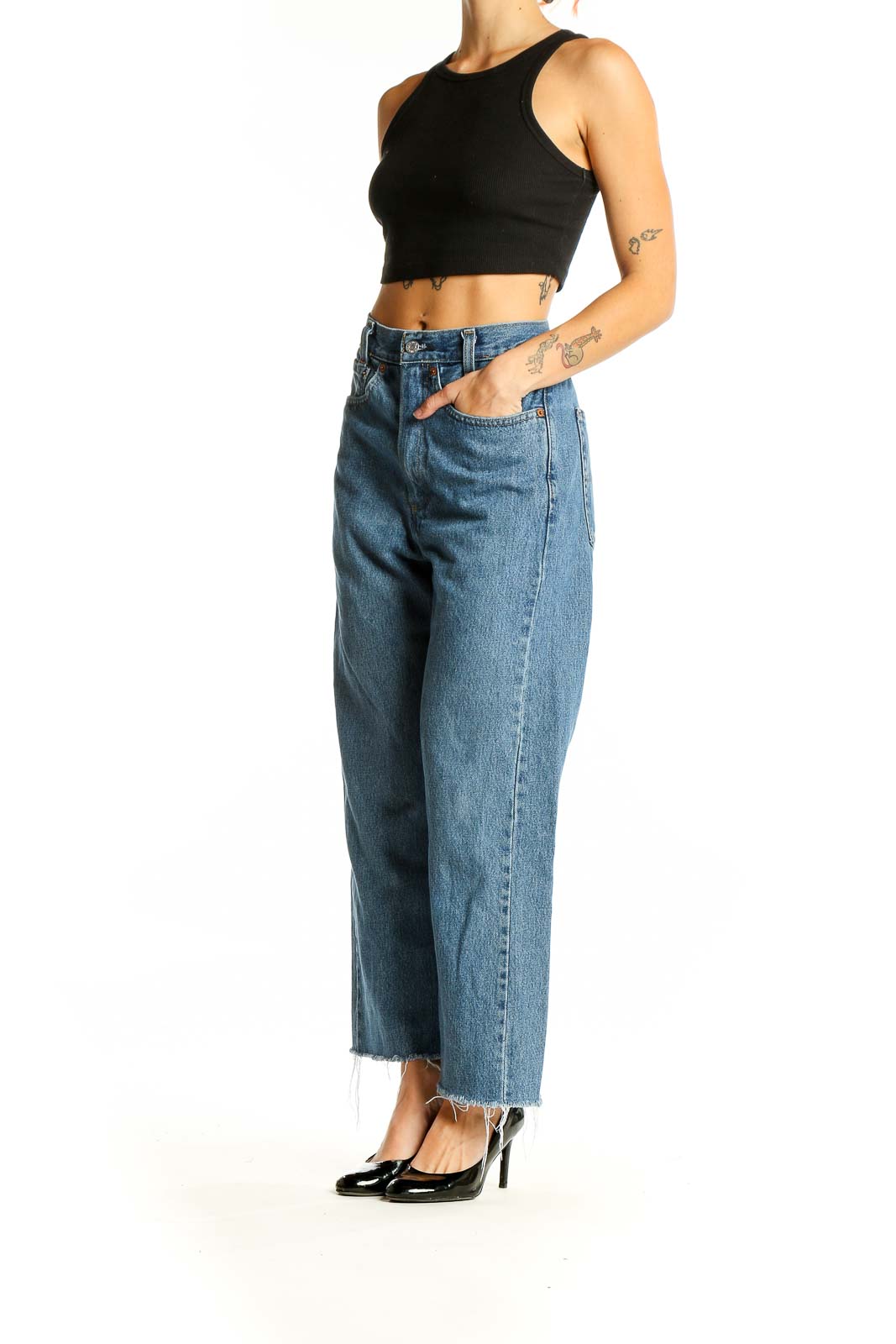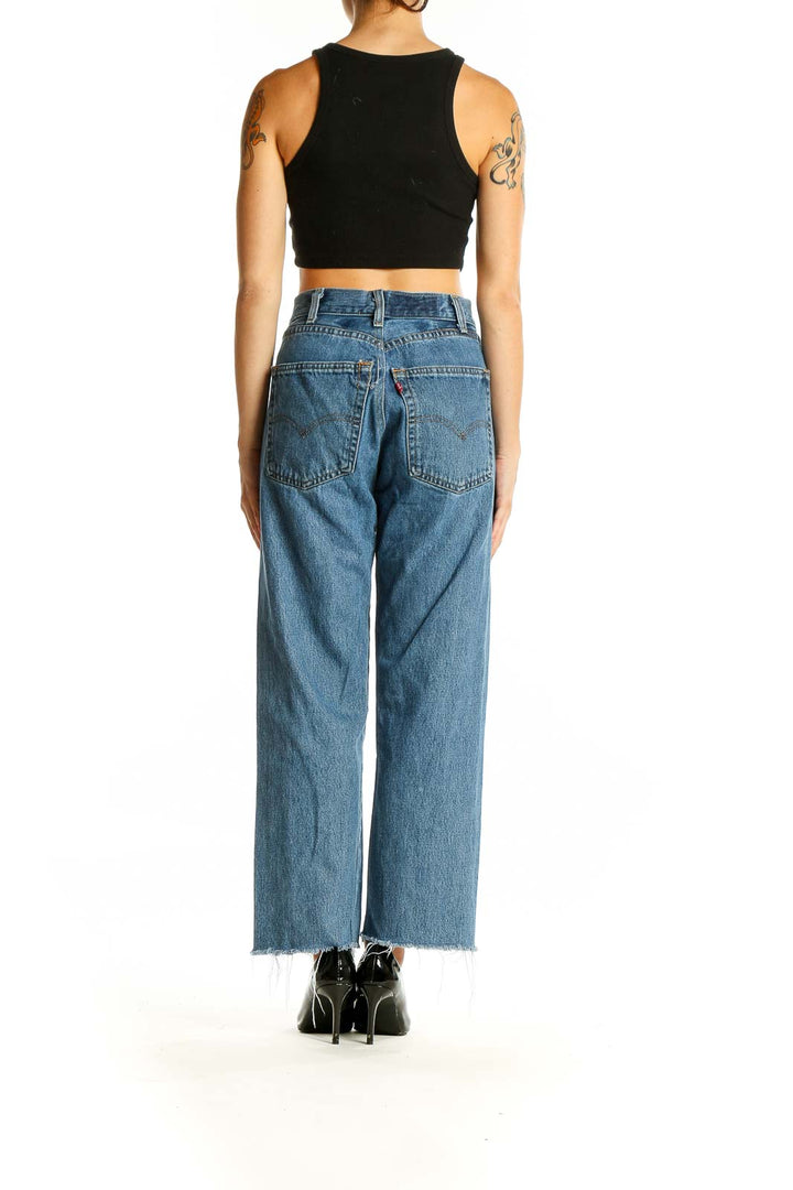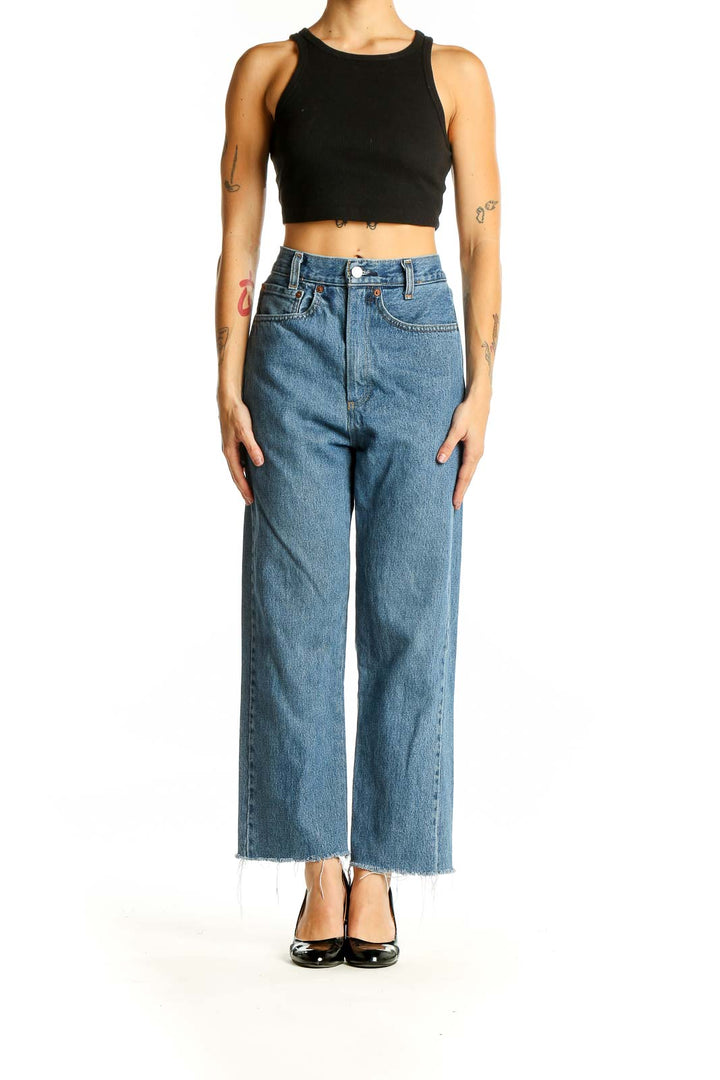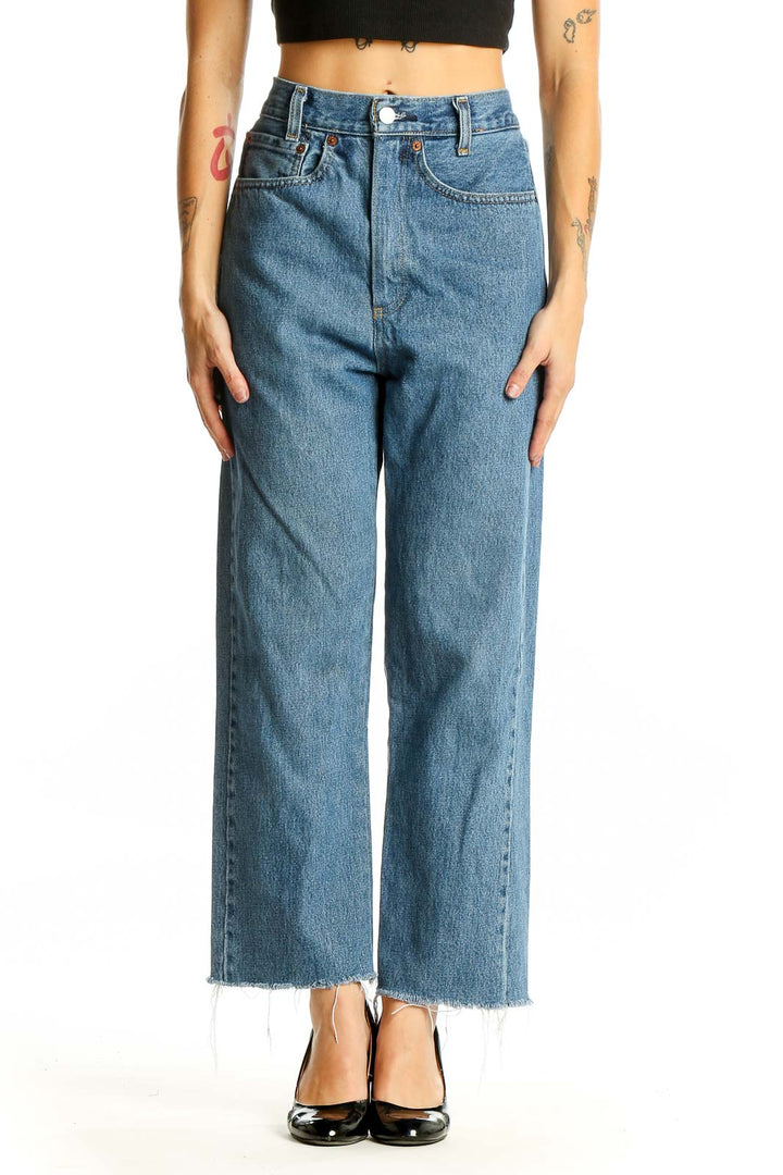 Step into effortless style with these classic blue wide-leg jeans from Levi's. Crafted from 100% cotton, these jeans offer both comfort and durability for all-day wear. The high-waisted design flatters your figure, while the wide-leg silhouette provides a trendy, relaxed look. The frayed hem adds a touch of edgy detail, perfect for pairing with your favorite sneakers or heels. With a waist measurement of 30", hip measurement of 32", and a generous 37" length, these medium-sized jeans offer a comfortable fit for various body types. In excellent condition, these Levi's jeans are a versatile addition to any wardrobe, easily transitioning from casual daytime looks to stylish evening outfits.