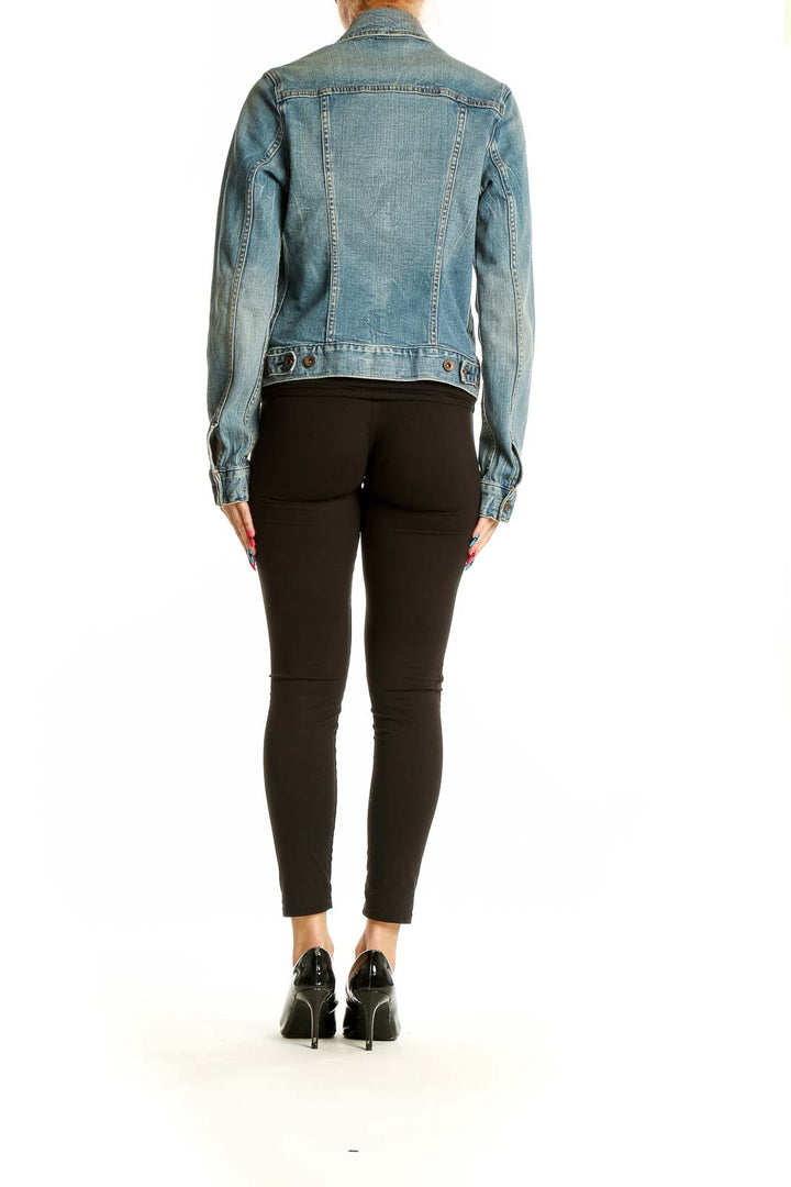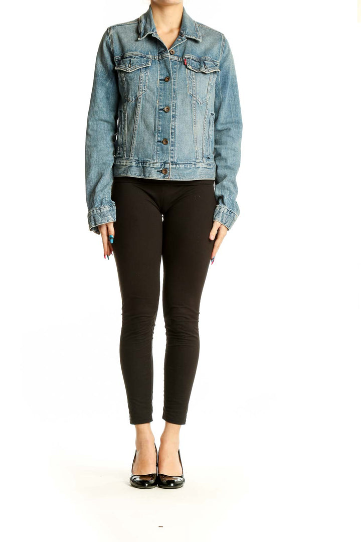 Elevate your casual wardrobe with this timeless Levi's denim jacket in a versatile light blue wash. Crafted from a comfortable blend of cotton and spandex, this jacket offers both durability and flexibility for all-day wear. The classic silhouette features traditional details like chest flap pockets, button-up front, and a collared neckline, embodying the iconic Levi's style.