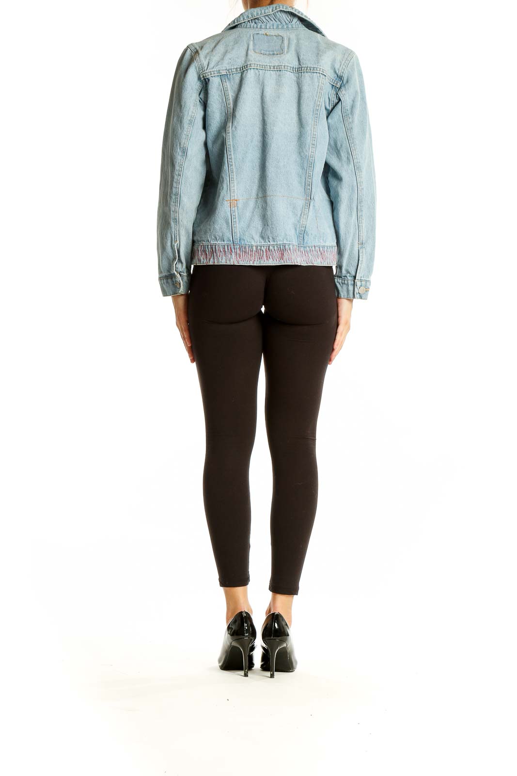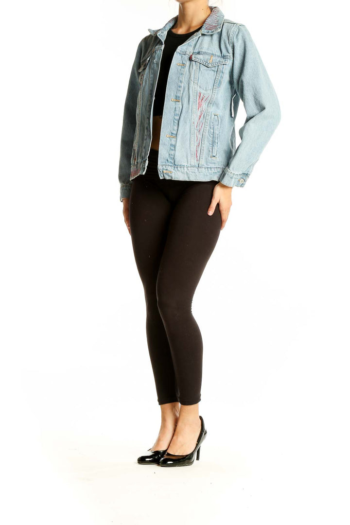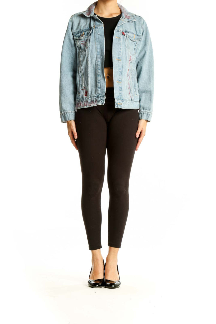 Crafted from sturdy denim, this jacket offers both style and functionality. Its versatile light blue color pairs effortlessly with a variety of outfits, while the embroidered accents on the front and back provide a unique, eye-catching element. The traditional button-up front and collar maintain the iconic Levi's look, while the chest pockets offer practical storage.